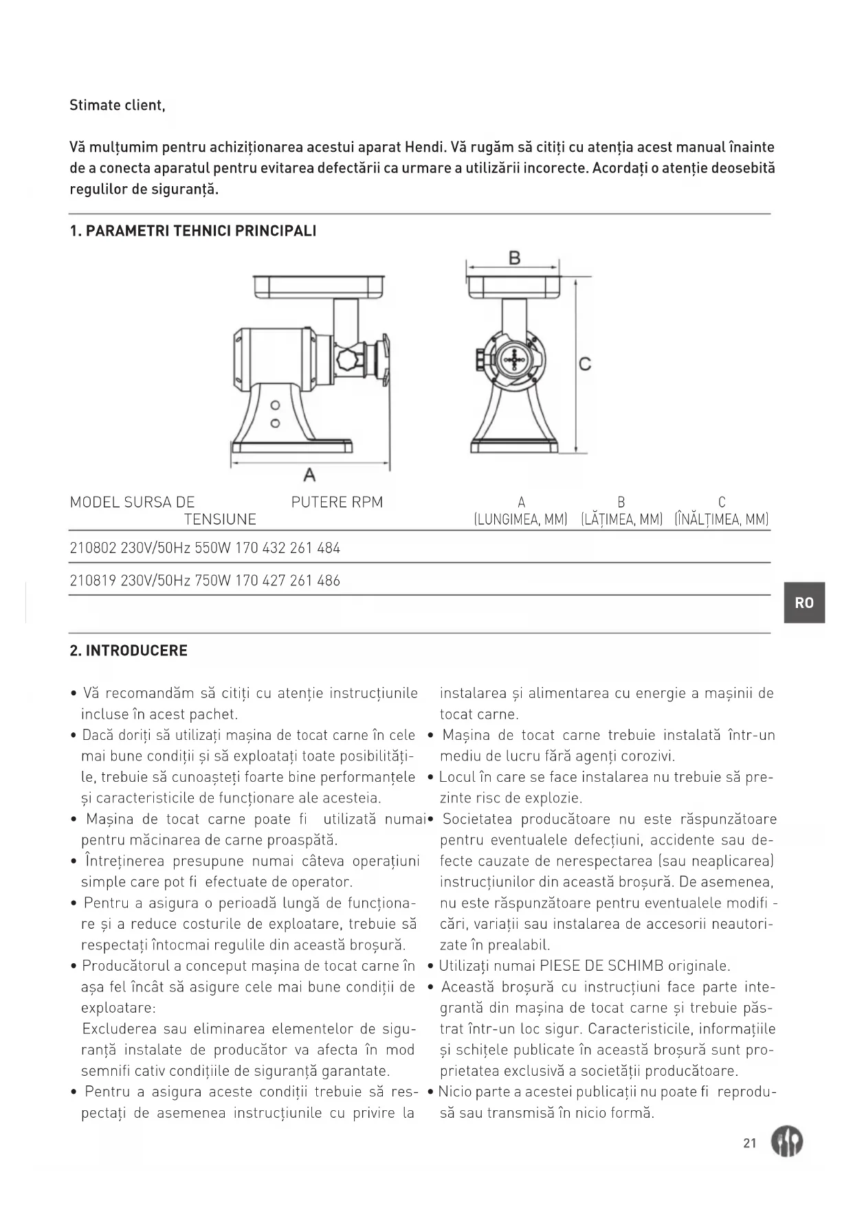 - Această broșură cu instrucțiuni face parte inte- grantă din mașina de tocat carne și trebuie păs- trat într-un loc sigur. Caracteristicile, informațiile și schițele publicate în această broșură sunt pro- prietatea exclusivă a societății producătoare.