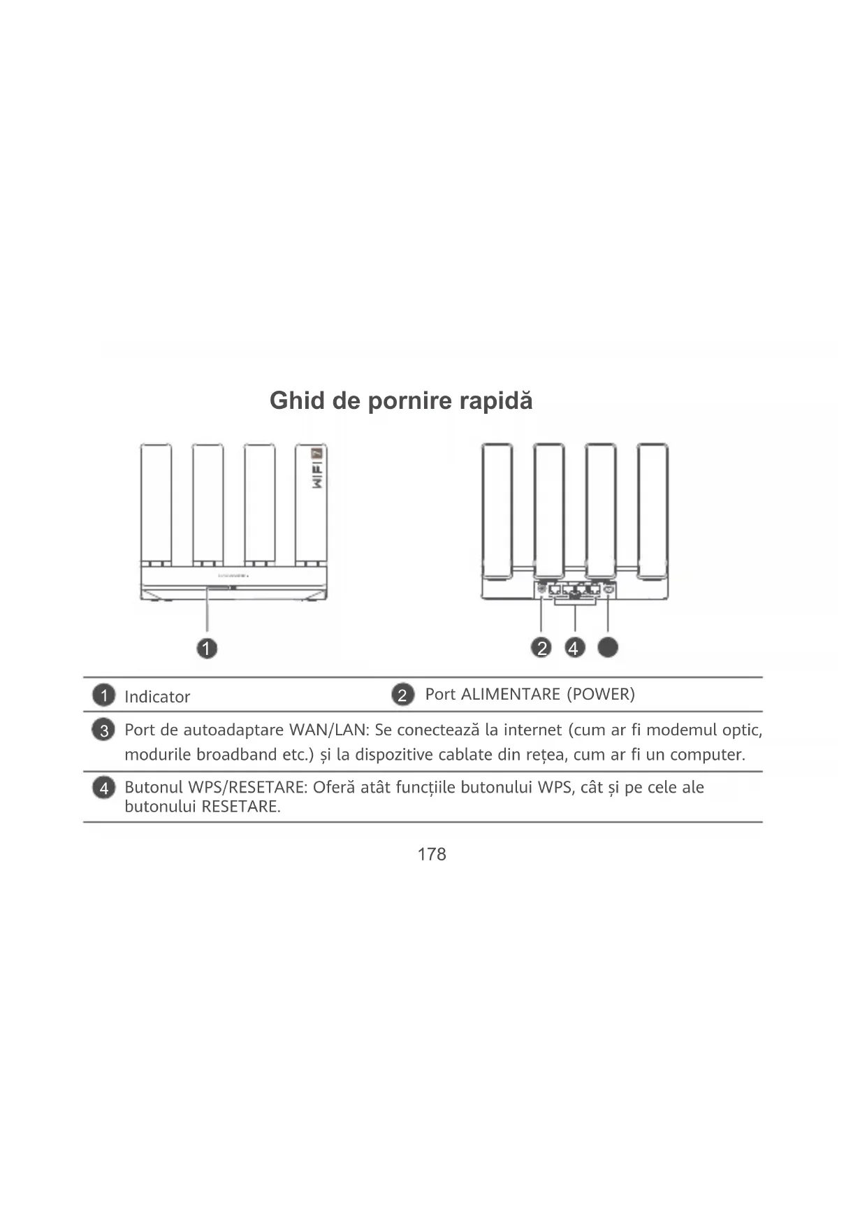 , emblema Wi-Fi CERTIFIED și emblema Wi-Fi sunt mărci comerciale ale Wi-Fi Alliance. Alte mărci comerciale, produse, servicii şi nume de companii menţionate pot aparţine proprietarilor respectivi. Actualizarea versiunii Pentru a îmbunătăți securitatea produsului și pentru a vă oferi o experiență de utilizare mai bună, vă vom transmite informații push privind actualizarea versiunii în mod regulat, atunci când este lansată o actualizare importantă. Politica de condențialitate Pentru a înțelege mai bine modul în care utilizăm și vă protejăm informațiile personale, citiți politica de condențialitate la adresa: https://consumer.huawei.com/privacy-policy. Acord de licență pentru utilizatorul nal Citiți și exprimați-vă consimțământul față de Acordul de licență pentru utilizatorul nal (HUAWEI EULA) de pe pagina de gestionare a produsului înainte de utilizarea produsului. Pentru mai multă asistenţă Vizitaţi https://consumer.huawei.com/en/support/hotline pentru a aa adresa de e-mail şi numărul pentru asistenţă actualizate pentru ţara sau regiunea dvs. Pentru mai multe informații privind funcțiile de accesibilitate, vă rugăm să vizitați site-ul ocial Huawei și să consultați Ghidul privind accesibilitatea produselor din punctele de acces (Accessibility Guide of Access Point Products).191 Stručná úvodní příručka Tlačítko WPS/RESETOVAT: Poskytuje funkce tlačítka WPS i tlačítka RESETOVAT. Automaticky adaptivní port WAN/LAN: Připojí se k internetu (jako je např. optický modem, širokopásmové modemy apod.) a kabelovému síťovému zařízení, jako je např. počítač. Port Napájení (POWER) Kontrolka