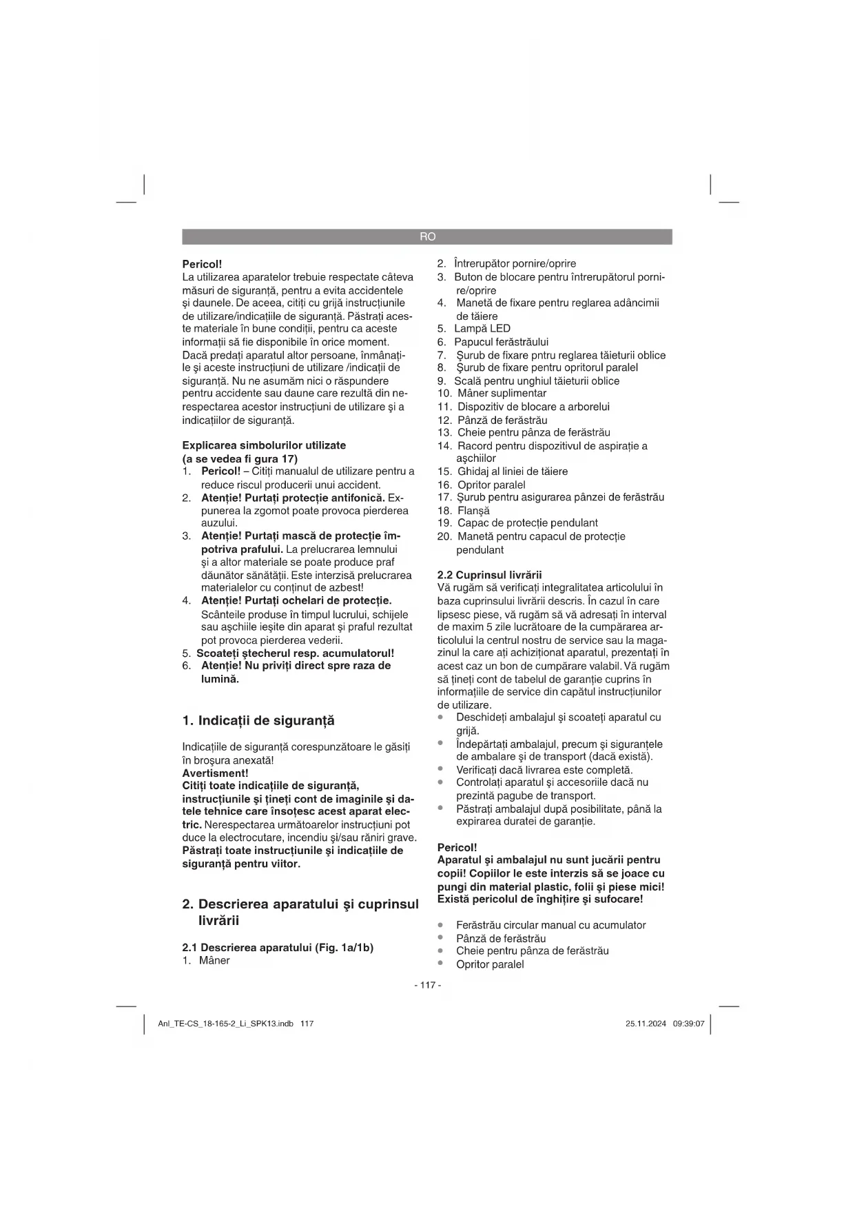 Asiguraţi-vă înaintea oricărei utilizări a maşinii că dispozitivele de siguranţă cum sunt Anl_TE-CS_18-165-2_Li_SPK13.indb 120Anl_TE-CS_18-165-2_Li_SPK13.indb 120 25.11.2024 09:39:0825.11.2024 09:39:08RO