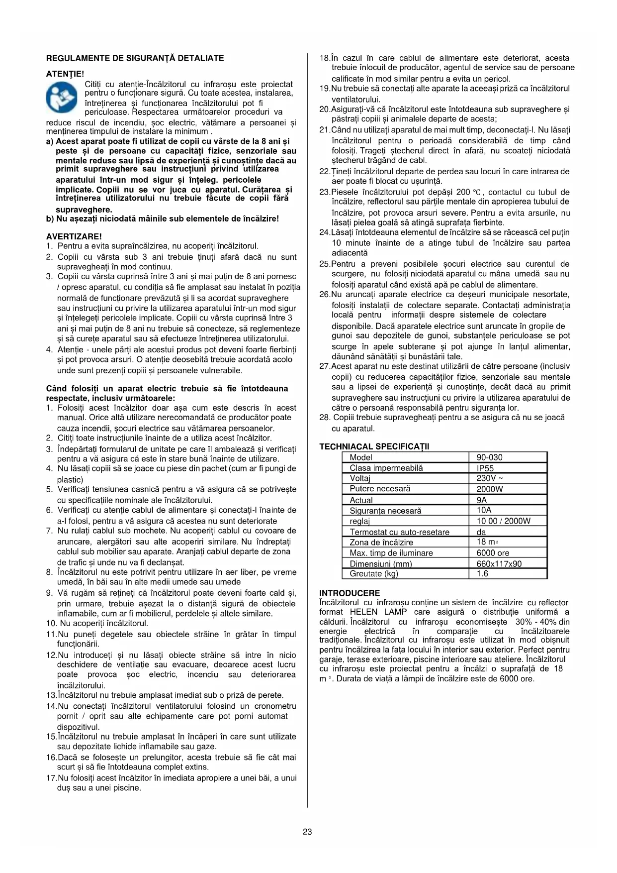 ATENŢIE! Citiți cu atenție-Încălzitorul cu infraroșu este proiectat pentru o funcționare sigură. Cu toate acestea, instalarea, întreținerea și funcționarea încălzitorului pot fi periculoase. Respectarea următoarelor proceduri va reduce riscul de incendiu, șoc electric, vătămare a persoanei și menținerea timpului de instalare la minimum . a) Acest aparat poate fi utilizat de copii cu vârste de la 8 ani și peste și de persoane cu capacități fizice, senzoriale sau mentale reduse sau lipsă de experiență și cunoștințe dacă au primit supraveghere sau instrucțiuni privind utilizarea aparatului într-un mod sigur și înțeleg. pericolele implicate. Copiii nu se vor juca cu aparatul. Curățarea și întreținerea utilizatorului nu trebuie făcute de copii fără supraveghere. b) Nu așezați niciodată mâinile sub elementele de încălzire! AVERTIZARE!