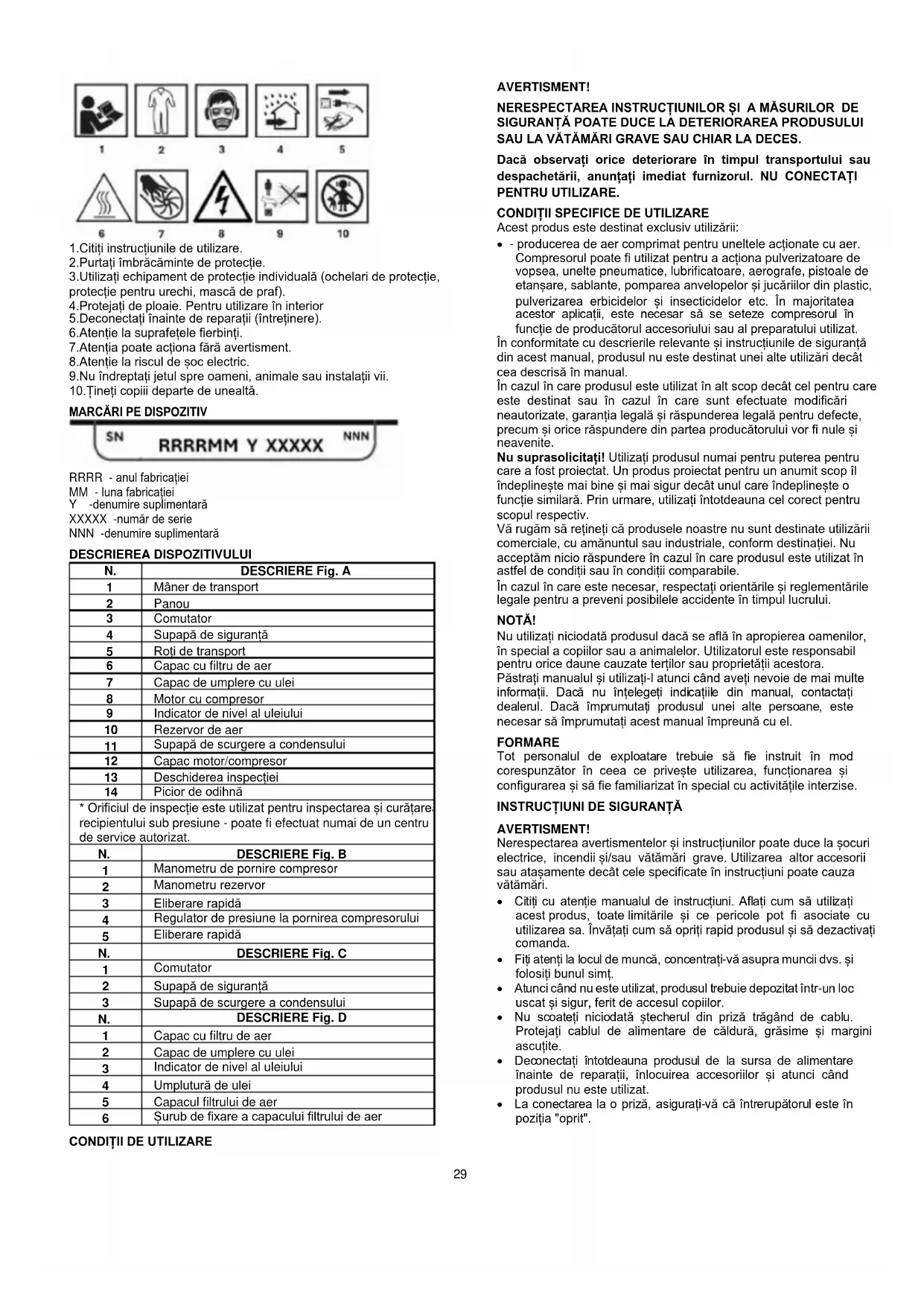 - Acest produs a fost proiectat în conformitate cu toate cerințele și standardele de siguranță care i se aplică. Orice reparație trebuie efectuată numai de către o persoană calificată, iar piesele de schimb trebuie înlocuite cu cele originale, în caz contrar utilizatorul se poate afla în pericol grav. INSTRUCȚIUNI DE SIGURANȚĂ PENTRU LUCRUL CU UN COMPRESOR