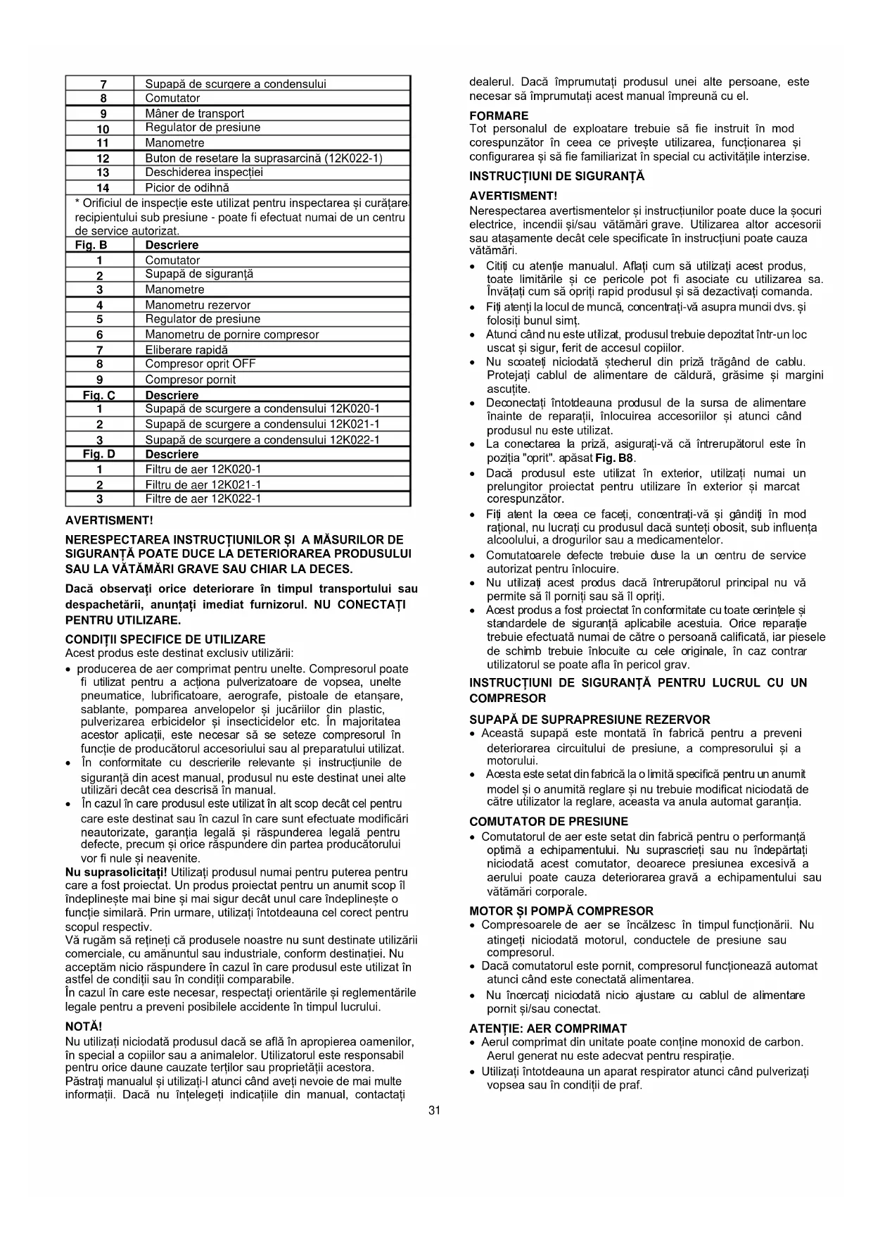 - Acest produs a fost proiectat în conformitate cu toate cerințele și standardele de siguranță aplicabile acestuia. Orice reparație trebuie efectuată numai de către o persoană calificată, iar piesele de schimb trebuie înlocuite cu cele originale, în caz contrar utilizatorul se poate afla în pericol grav. INSTRUCȚIUNI DE SIGURANȚĂ PENTRU LUCRUL CU UN COMPRESOR