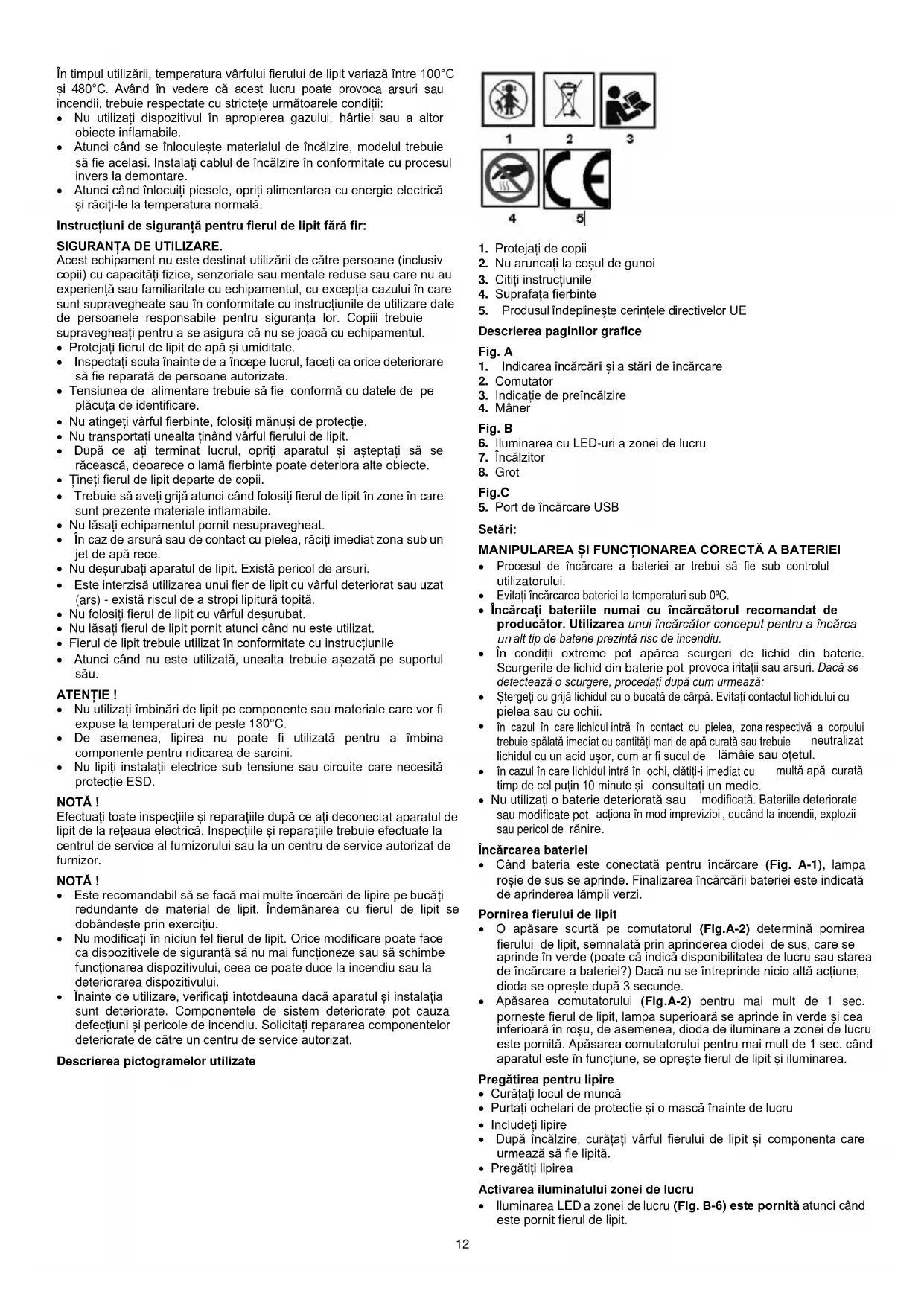 MANUAL DE TRADUCERE (UTILIZATOR) Fier de lipit fără fir 19-250 NOTĂ! Citiți cu atenție instrucțiunile și familiarizați-vă cu ele. Păstrați instrucțiunile pentru utilizare ulterioară. Respectați instrucțiunile pentru a evita accidentele. Pentru siguranța dumneavoastră, vă rugăm să citiți cu atenție instrucțiunile. Înțelegeți pe deplin modul de utilizare a produsului pentru a preveni accidentele cauzate de o utilizare necorespunzătoare. NOTĂ!12 În timpul utilizării, temperatura vârfului fierului de lipit variază între 100°C și 480°C. Având în vedere că acest lucru poate provoca arsuri sau incendii, trebuie respectate cu strictețe următoarele condiții: