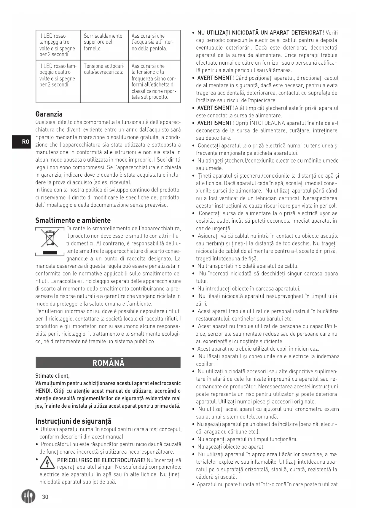 bilità per il riciclaggio, il trattamento e lo smaltimento ecologi- co, né direttamente né tramite un sistema pubblico. ROMÂNĂ Stimate client, Vă mulţumim pentru achiziţionarea acestui aparat electrocasnic HENDI. Citiţi cu atenţie acest manual de utilizare, acordând o atenţie deosebită reglementărilor de siguranţă evidenţiate mai jos, înainte de a instala şi utiliza acest aparat pentru prima dată. Instrucțiuni de siguranță