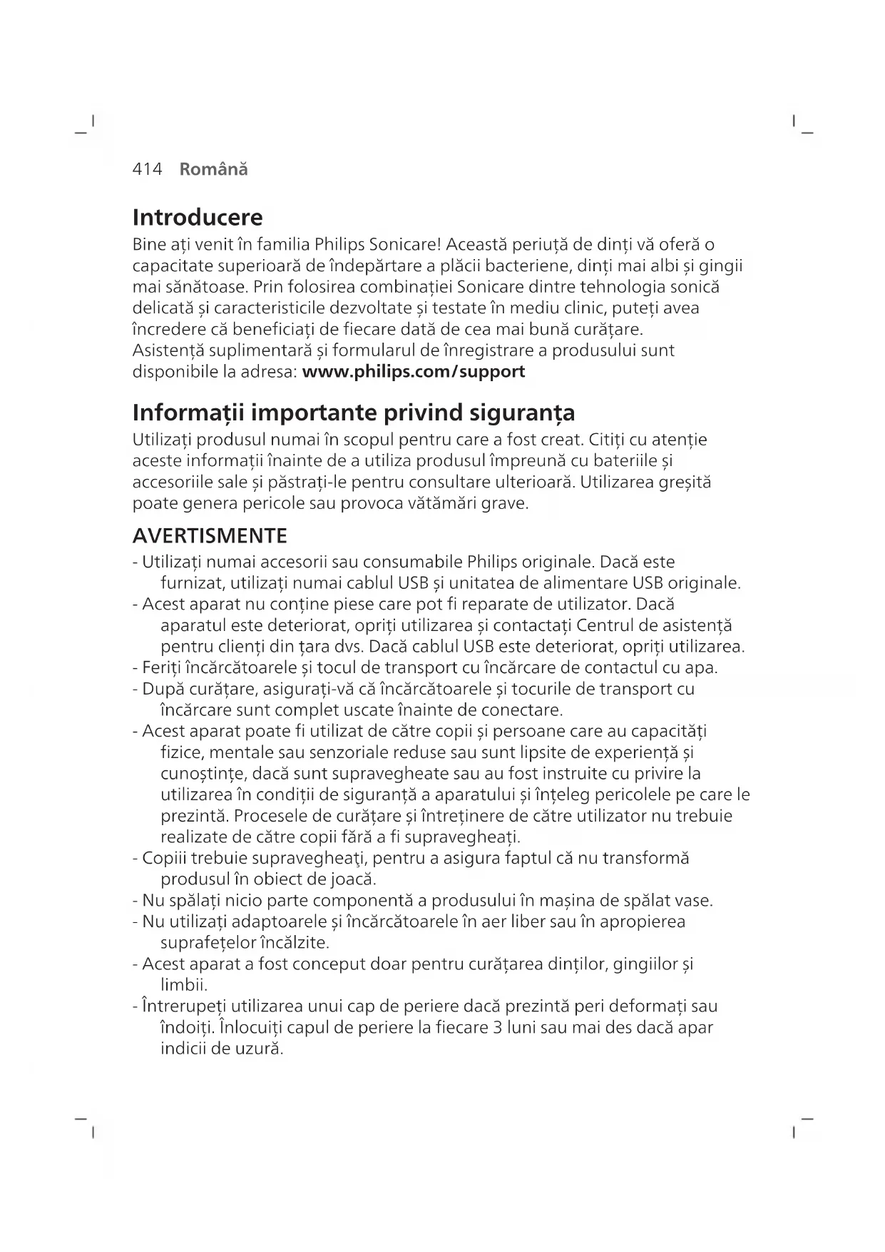 Română Introducere Bine ați venit în familia Philips Sonicare! Această periuță de dinți vă oferă o capacitate superioară de îndepărtare a plăcii bacteriene, dinți mai albi și gingii mai sănătoase. Prin folosirea combinației Sonicare dintre tehnologia sonică delicată și caracteristicile dezvoltate și testate în mediu clinic, puteți avea încredere că beneficiați de fiecare dată de cea mai bună curățare. Asistență suplimentară și formularul de înregistrare a produsului sunt disponibile la adresa: www.philips.com/support Informații importante privind siguranța Utilizați produsul numai în scopul pentru care a fost creat. Citiți cu atenție aceste informații înainte de a utiliza produsul împreună cu bateriile și accesoriile sale și păstrați-le pentru consultare ulterioară. Utilizarea greșită poate genera pericole sau provoca vătămări grave. AVERTISMENTE - Utilizați numai accesorii sau consumabile Philips originale. Dacă este furnizat, utilizați numai cablul USB și unitatea de alimentare USB originale. - Acest aparat nu conține piese care pot fi reparate de utilizator. Dacă aparatul este deteriorat, opriți utilizarea și contactați Centrul de asistență pentru clienți din țara dvs. Dacă cablul USB este deteriorat, opriți utilizarea. - Feriți încărcătoarele și tocul de transport cu încărcare de contactul cu apa. - După curățare, asigurați-vă că încărcătoarele și tocurile de transport cu încărcare sunt complet uscate înainte de conectare. - Acest aparat poate fi utilizat de către copii și persoane care au capacități fizice, mentale sau senzoriale reduse sau sunt lipsite de experiență și cunoștințe, dacă sunt supravegheate sau au fost instruite cu privire la utilizarea în condiții de siguranță a aparatului și înțeleg pericolele pe care le prezintă. Procesele de curățare și întreținere de către utilizator nu trebuie realizate de către copii fără a fi supravegheați. - Copiii trebuie supravegheaţi, pentru a asigura faptul că nu transformă produsul în obiect de joacă. - Nu spălați nicio parte componentă a produsului în mașina de spălat vase. - Nu utilizați adaptoarele și încărcătoarele în aer liber sau în apropierea suprafețelor încălzite. - Acest aparat a fost conceput doar pentru curățarea dinților, gingiilor și limbii. - Întrerupeți utilizarea unui cap de periere dacă prezintă peri deformați sau îndoiți. Înlocuiți capul de periere la fiecare 3 luni sau mai des dacă apar indicii de uzură.415 Română - Evitaţi contactul direct cu produse care conţin uleiuri esenţiale sau ulei de cocos. Contactul poate conduce la dislocarea perilor. - Altitudinea maximă de utilizare este de 4.500 de metri. AVERTISMENTE MEDICALE - Opriți utilizarea aparatului și consultați stomatologul/medicul dacă apar sângerări excesive după utilizare, dacă sângerarea continuă să apară după 1 săptămână de utilizare sau dacă prezentați disconfort sau durere. - Dacă ați suferit intervenții chirurgicale la gingii sau în cavitatea bucală în ultimele 2 luni, consultați medicul stomatolog înainte de a utiliza acest aparat. - Dacă aveți un stimulator cardiac sau alte dispozitive implantate, contactați medicul sau producătorul dispozitivului implantat, înainte de utilizare. - Dacă aveți probleme medicale, consultați medicul înainte de a utiliza acest aparat. - Acest aparat este un dispozitiv de îngrijire personală și nu este conceput pentru a fi utilizat de mai mulți pacienți într-un cabinet dentar sau o instituție de stomatologie.