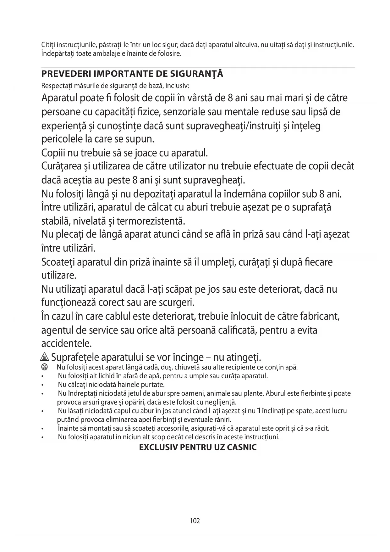 Respectaţi măsurile de siguranţă de bază, inclusiv: Aparatul poate folosit de copii în vârstă de 8 ani sau mai mari și de către persoane cu capacități zice, senzoriale sau mentale reduse sau lipsă de experiență și cunoștințe dacă sunt supravegheați/instruiți și înțeleg pericolele la care se supun. Copiii nu trebuie să se joace cu aparatul. Curățarea și utilizarea de către utilizator nu trebuie efectuate de copii decât dacă aceștia au peste 8 ani și sunt supravegheați. Nu folosiţi lângă şi nu depozitaţi aparatul la îndemâna copiilor sub 8 ani. Între utilizări, aparatul de călcat cu aburi trebuie așezat pe o suprafață stabilă, nivelată și termorezistentă. Nu plecați de lângă aparat atunci când se aă în priză sau când l-ați așezat între utilizări. Scoateți aparatul din priză înainte să îl umpleți, curățați și după ecare utilizare. Nu utilizați aparatul dacă l-ați scăpat pe jos sau este deteriorat, dacă nu funcționează corect sau are scurgeri. În cazul în care cablul este deteriorat, trebuie înlocuit de către fabricant, agentul de service sau orice altă persoană calicată, pentru a evita accidentele. h Suprafețele aparatului se vor încinge – nu atingeți. b Nu folosiţi acest aparat lângă cadă, duş, chiuvetă sau alte recipiente ce conţin apă.