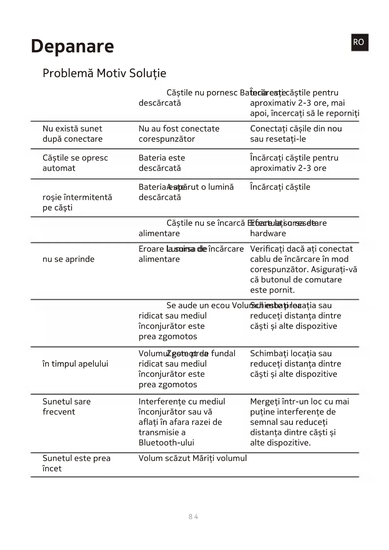 ROProblemă Motiv Soluție Depanare Căștile nu pornesc Bateria este descărcată Încărcați căștile pentru aproximativ 2-3 ore, mai apoi, încercați să le reporniți Nu există sunet după conectare Nu au fost conectate corespunzător Conectați cășile din nou sau resetați-le Căștile se opresc automat Bateria este descărcată Încărcați căștile pentru aproximativ 2-3 ore Sunetul este prea încet Volum scăzut Măriți volumul Se aude un ecou Volumul este prea ridicat sau mediul înconjurător este prea zgomotos Schimbați locația sau reduceți distanța dintre căști și alte dispozitive Zgomot de fundal în timpul apelului Volumul este prea ridicat sau mediul înconjurător este prea zgomotos Schimbați locația sau reduceți distanța dintre căști și alte dispozitive Sunetul sare frecvent Interferențe cu mediul înconjurător sau vă aați în afara razei de transmisie a Bluetooth-ului Mergeți într-un loc cu mai puține interferențe de semnal sau reduceți distanța dintre căști și alte dispozitive. A apărut o lumină roșie întermitentă pe căști Bateria este descărcată Încărcați căștile Căștile nu se încarcă Eroare la sursa de alimentare Efectuați o resetare hardware Lumina de încărcare nu se aprinde Eroare la sursa de alimentare Vericați dacă ați conectat cablu de încărcare în mod corespunzător. Asigurați-vă că butonul de comutare este pornit.