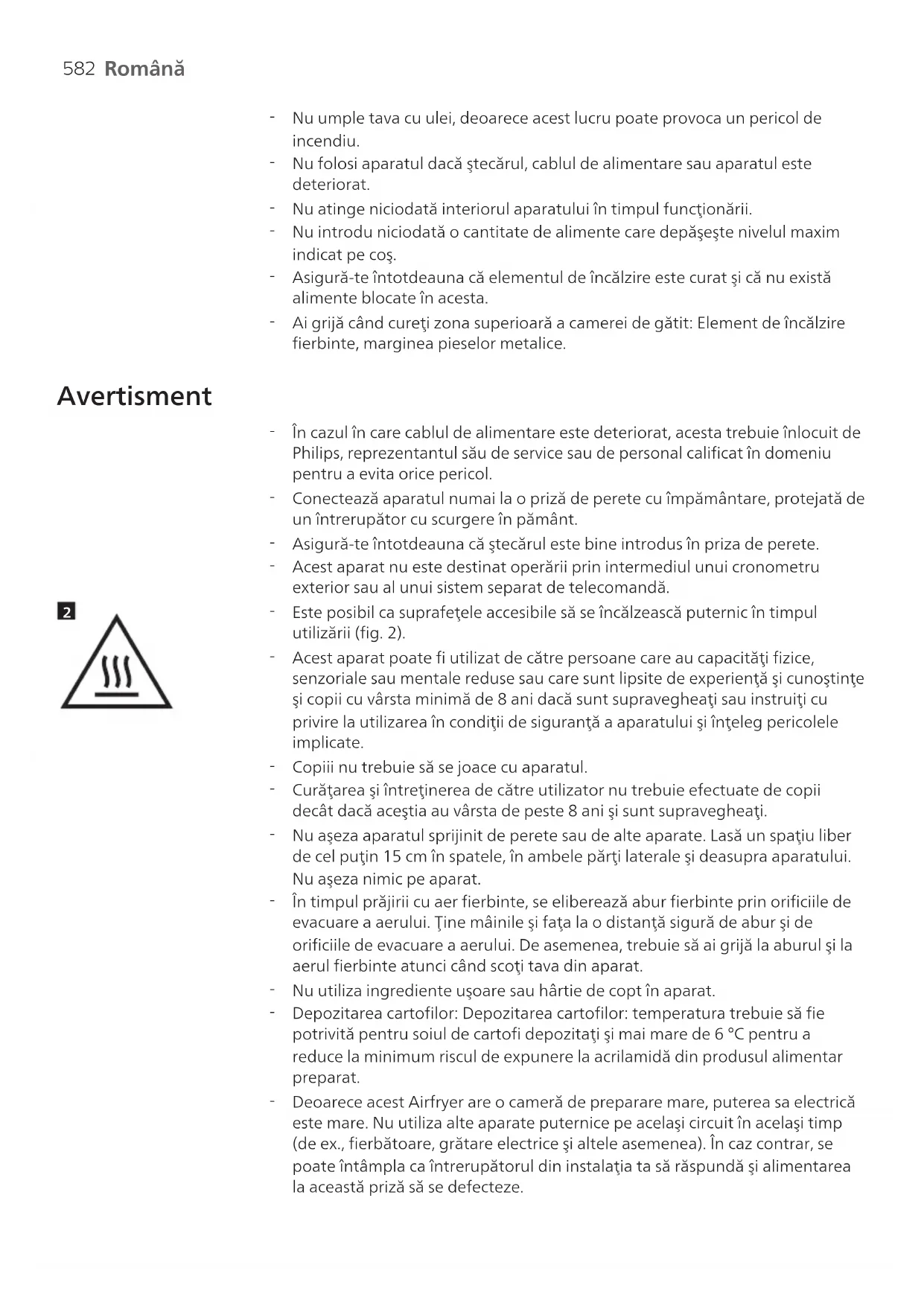 Deoarece acest Airfryer are o cameră de preparare mare, puterea sa electrică este mare. Nu utiliza alte aparate puternice pe acelaşi circuit în acelaşi timp (de ex., fierbătoare, grătare electrice şi altele asemenea). În caz contrar, se poate întâmpla ca întrerupătorul din instalaţia ta să răspundă şi alimentarea la această priză să se defecteze.583 Română