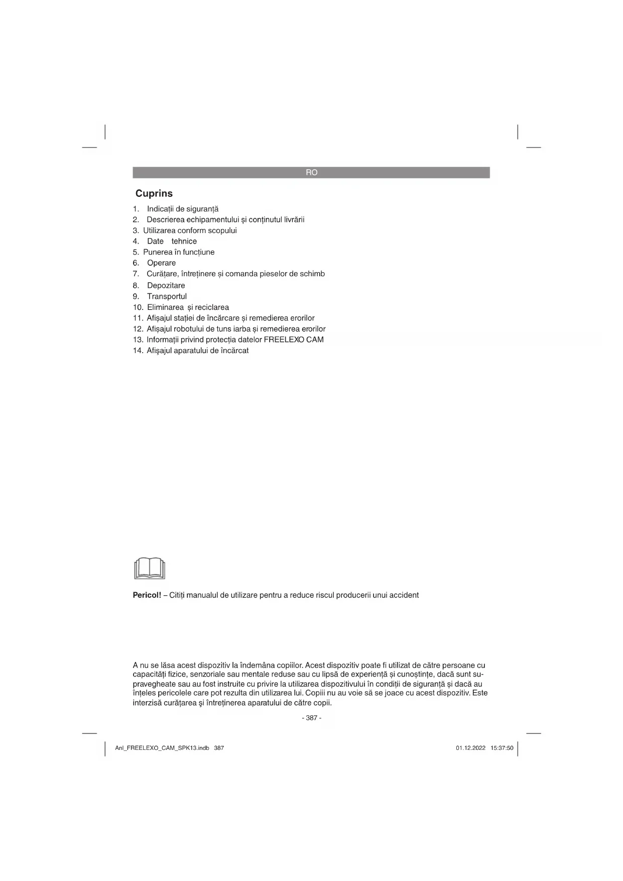 Pericol! – Citiţi manualul de utilizare pentru a reduce riscul producerii unui accident A nu se lăsa acest dispozitiv la îndemâna copiilor. Acest dispozitiv poate fi utilizat de către persoane cu capacităţi fi zice, senzoriale sau mentale reduse sau cu lipsă de experienţă și cunoștinţe, dacă sunt su- pravegheate sau au fost instruite cu privire la utilizarea dispozitivului în condiţii de siguranţă și dacă au înţeles pericolele care pot rezulta din utilizarea lui. Copiii nu au voie să se joace cu acest dispozitiv. Este interzisă curăţarea şi întreţinerea aparatului de către copii. Anl_FREELEXO_CAM_SPK13.indb 387Anl_FREELEXO_CAM_SPK13.indb 387 01.12.2022 15:37:5001.12.2022 15:37:50RO