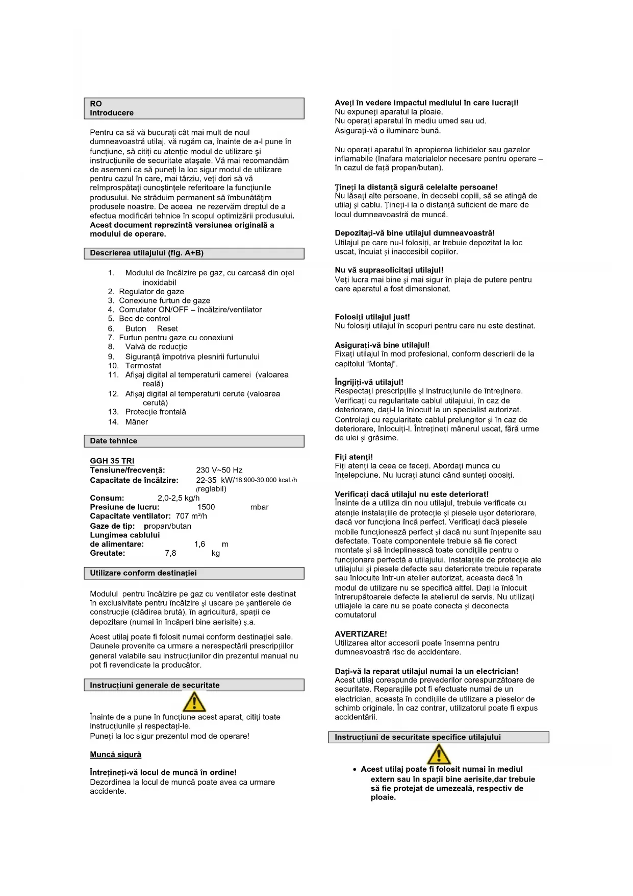 Date tehnice GGH 35 TRI Tensiune/frecvență: 230 V~50 Hz Capacitate de încălzire: 22-35 kW/ 18.900-30.000 kcal./h (reglabil) Consum: 2,0-2,5 kg/h Presiune de lucru: 1500 mbar Capacitate ventilator: 707 m³/h Gaze de tip: propan/butan Lungimea cablului de alimentare: 1,6 m Greutate: 7,8 kg Utilizare conform destinației Modulul pentru încălzire pe gaz cu ventilator este destinat în exclusivitate pentru încălzire și uscare pe șantierele de construcție (clădirea brută), în agricultură, spații de depozitare (numai în încăperi bine aerisite) ș.a. Acest utilaj poate fi folosit numai conform destinației sale. Daunele provenite ca urmare a nerespectării prescripțiilor general valabile sau instrucțiunilor din prezentul manual nu pot fi revendicate la producător. Instrucțiuni generale de securitate Înainte de a pune în funcțiune acest aparat, citiți toate instrucțiunile și respectați-le. Puneți la loc sigur prezentul mod de operare! Muncă sigură Întrețineți-vă locul de muncă în ordine! Dezordinea la locul de muncă poate avea ca urmare accidente.