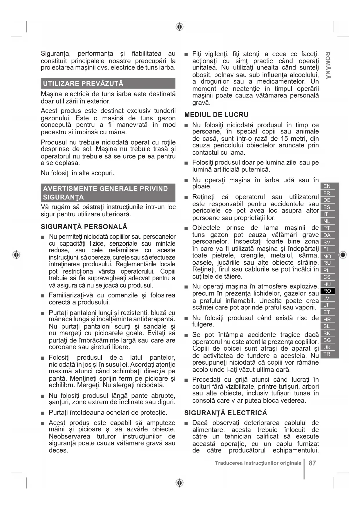 ■ Nu folosiţi niciodată produsul în timp ce persoane, în special copii sau animale de casă, sunt într-o rază de 15 metri, din cauza pericolului obiectelor aruncate prin contactul cu lama. ■ Folosiţi produsul doar pe lumina zilei sau pe lumină artificială puternică. ■ Nu operaţi maşina în iarba udă sau în ploaie. ■ Reţineţi că operatorul sau utilizatorul este responsabil pentru accidentele sau pericolele ce pot avea loc asupra altor persoane sau proprietăţii lor. ■ Obiectele prinse de lama maşinii de tuns gazon pot cauza vătămări grave persoanelor. Inspectaţi foarte bine zona în care va fi utilizată maşina şi îndepărtaţi toate pietrele, crengile, metalul, sârma, oasele, jucăriile sau alte obiecte străine. Reţineţi, firul sau cablurile se pot încâlci în cuţitele de tăiere. ■ Nu operaţi maşina în atmosfere explozive, precum în prezenţa lichidelor, gazelor sau a prafului inflamabil. Unealta poate crea scântei care pot aprinde praful sau vaporii. ■ Nu folosiţi produsul când există risc de fulgere. ■ Se pot întâmpla accidente tragice dacă operatorul nu este atent la prezenţa copiiilor. Copiii de obicei sunt atraşi de aparat şi de activitatea de tundere a acesteia. Nu presupuneţi niciodată că copiii vor rămâne acolo unde i-aţi văzut ultima oară. ■ Procedați cu grijă atunci când lucrați în colțuri fără vizibilitate, printre tufișuri, arbori sau alte obiecte, inclusiv tufișuri tunse în consolă care v-ar putea bloca vederea. SIGURANŢĂ ELECTRICĂ ■ Dacă observați deteriorarea cablului de alimentare, acesta trebuie înlocuit de către un tehnician calificat să execute această operație, cu un cablu furnizat de către producătorul echipamentului.88 Traducerea instrucţiunilor originale Nerespectarea aceste instrucțiuni poate determina accidente grave, inclusiv electrocutarea dvs. sau a altor persoane. ■ Dacă trebuie să utilizați un cablu prelungitor, asigurați-vă că acesta este potrivit pentru utilizarea în aer liber și că are o capacitate de curent suficientă pentru alimentarea produsului. Cablul prelungitor trebuie să fie marcat fie "H05 RN F", fie "H05 VV F". Verificaţi după fiecare folosire dacă este deteriorată, întotdeauna desfăşuraţi cablul în timpul folosirii întrucât cablul înfăşurat se poate supraîncălzi. Cablurile prelungitoare deteriorate nu trebuie reparate, ele trebuie înlocuite cu un model echivalent. ■ Înainte de utilizare, verificaţi cablurile de alimentare şi de prelungire pentru semne de deteriorare sau de uzură. În cazul în care cablul este deteriorat în timpul utilizării, deconectaţi cablul de la priză imediat. Nu atingeţi cablul de alimentare înainte de a-l deconecta de la sursa de alimentare. Nu utilizaţi maşina în cazul în care cablul este deteriorat sau uzat. ■ Energia electrică trebuie să fie furnizată printr-un dispozitiv pentru curent rezidual (RCD) cu un curent de declanşare de nu mai mult de 30 mA. ■ Asiguraţi-vă că poziţionarea cablului de alimentare este în aşa fel încât nu poate fi deteriorat prin mijloace de tăiere şi că nu se va călca peste el, nu vă împiedicaţi de el sau să nu-l supuneţi stresului. ■ Ştecherele trebuie să se potrivească cu prizele. Nu modificaţi niciodată ştecărul în nici un fel. Nu folosiţi niciodată adaptoare de ştecăr cu uneltele electrice cu împământare. Ştecărele nemodificate şi prizele potrivite reduc riscul de electrocutare. ■ Evitaţi pornirile involuntare. Verificaţi întotdeauna că întrerupătorul este în poziţia Oprit înainte de conectarea produsului la priza electrică. Nu transportaţi un produs alimentat la priză având degetul pe butonul de pornire. ■ Evitaţi contactul corpului cu suprafeţele conectate la împământare, precum ţevi, radiatoare, reşouri, maşini de gătit şi frigidere. Există un risc crescut de electrocutare când corpul dumneavoastră are contact cu împământarea. ■ Nu ridicaţi sau transportaţi produsul de cablul electric. ■ Nu trageţi niciodată de cablul de alimentare pentru a deconecta de la sursa de alimentare. ■ Păstraţi cablul departe de căldură, ulei sau margini ascuţite. ■ Asiguraţi-vă că tensiunea este corectă pentru produsul Dvs. O etichetă de pe produs indică tensiunea produsului. Nu conectaţi produsul la o tensiune de curent alternativ care diferă de această tensiune. AVERTIZĂRI DE SIGURANŢĂ A MAŞINII DE TUNS IARBA. ■ Înainte de utilizare, inspectați întotdeauna vizual echipamentul pentru a vă asigura că lamele, șuruburile lamelor și ansamblul tăietor nu prezintă uzură și nici defecte. Înlocuiţi lamele şi şuruburile uzate sau deteriorate în seturi pentru a menţine echilibrul. ■ Duceţi produsul la un centru service autorizat pentru a înlocui etichetele deteriorate sau ilizibile. ■ Nu trageţi produsul înspre înapoi decât dacă e absolut necesar. Dacă trebuie să vă deplasaţi înapoi cu maşina pentru a evita un perete sau un obstacol, în primul rând uitaţi-vă în jos şi în spate pentru a evita împiedicarea sau trecerea cu maşina peste picioarele dvs. ■ Opriți funcționarea uneltei și lăsați lama să se oprească dacă unealta trebuie să fie înclinată pentru transport, când traversați suprafețe cu altceva în afară de iarbă și când transportați unealta către și de la zona de lucru. ■ Nu utilizați niciodată unealta cu protecțiile și apărătorile deteriorate, sau fără să fie montate la locul lor dispozitivele de siguranță precum deflectoarele și colectoarele de iarbă. ■ Nu mișcați produsul în timpul pornirii motorului sau în timp ce motorul este în funcționare. Dacă este absolut necesar, puteți înălța partea din față a mașinii pentru tuns gazonul cu nu mai mult de 5 cm pentru a permite pornirea facilă. Apăsați în jos pe mâner pentru realizarea acestui lucru. Înainte de tund