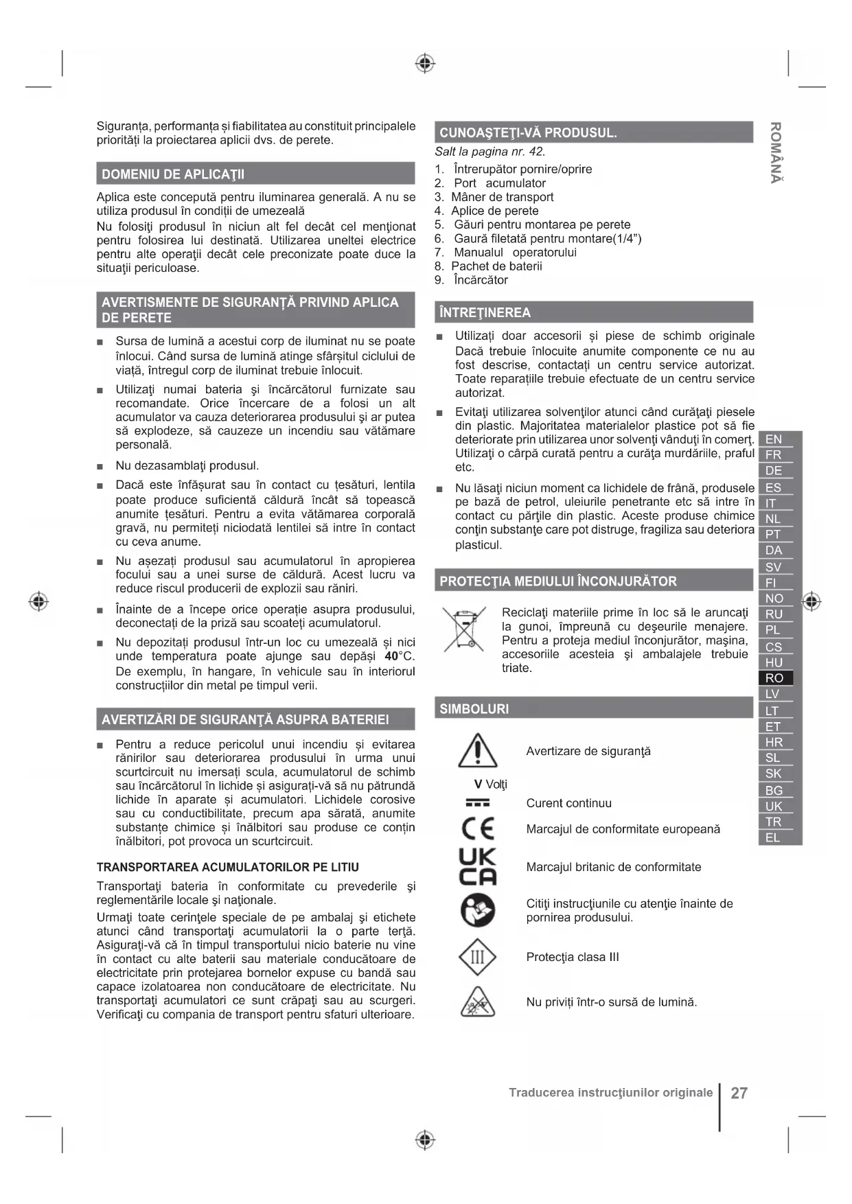 Reciclaţi materiile prime în loc să le aruncaţi la gunoi, împreună cu deşeurile menajere. Pentru a proteja mediul înconjurător, maşina, accesoriile acesteia şi ambalajele trebuie triate. SIMBOLURI Avertizare de siguranţă V Volţi Curent continuu Marcajul de conformitate europeană Marcajul britanic de conformitate Citiţi instrucţiunile cu atenţie înainte de pornirea produsului. Protecţia clasa III Nu priviți într-o sursă de lumină. ROMÂNĂ