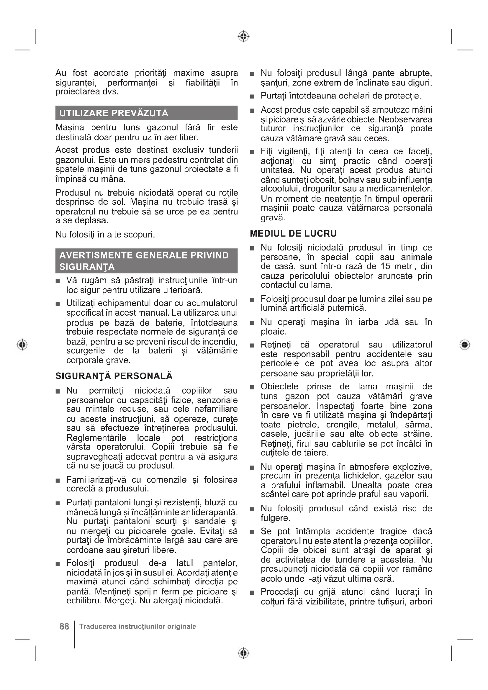 Mașina pentru tuns gazonul fără fi r este destinată doar pentru uz în aer liber. Acest produs este destinat exclusiv tunderii gazonului. Este un mers pedestru controlat din spatele maşinii de tuns gazonul proiectate a fi împinsă cu mâna. Produsul nu trebuie niciodată operat cu roţile desprinse de sol. Mașina nu trebuie trasă și operatorul nu trebuie să se urce pe ea pentru a se deplasa. Nu folosiţi în alte scopuri.