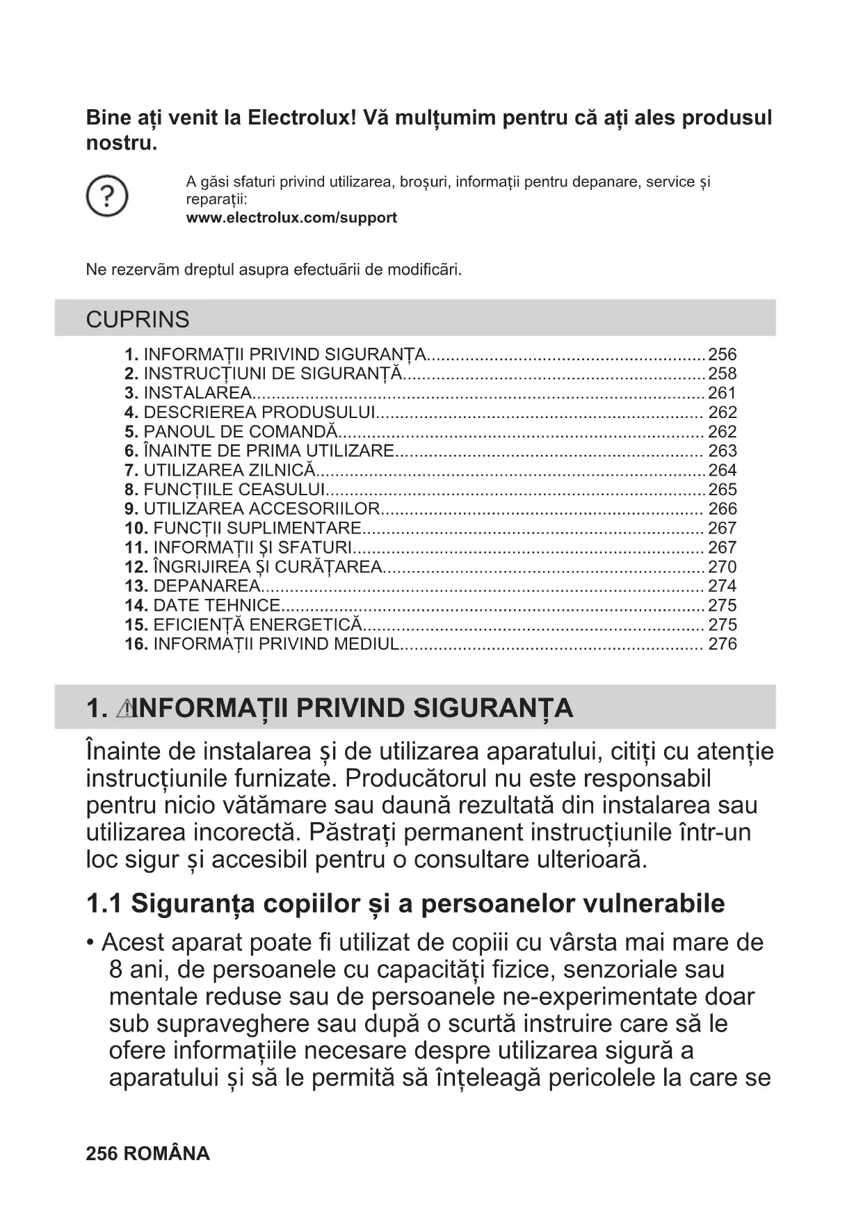 - Acest aparat poate fi utilizat de copiii cu vârsta mai mare de 8 ani, de persoanele cu capacități fizice, senzoriale sau mentale reduse sau de persoanele ne-experimentate doar sub supraveghere sau după o scurtă instruire care să le ofere informațiile necesare despre utilizarea sigură a aparatului și să le permită să înțeleagă pericolele la care se 256 ROMÂNAexpun. Copiii cu vârsta mai mică de 8 ani și persoanele cu dizabilități profunde și complexe nu trebuie lăsate să se apropie de aparat dacă nu sunt supravegheate permanent.