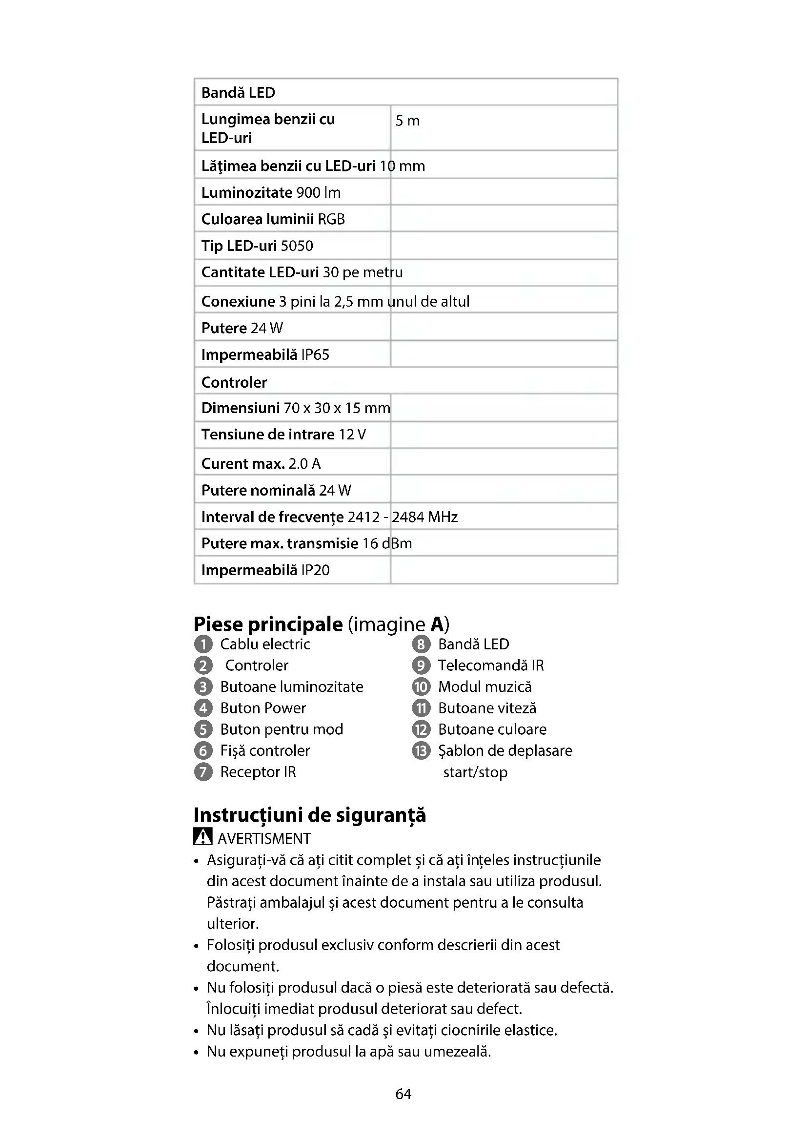 Ghid rapid de inițiere Bandă cu LED-uri smart Wi-Fi WIFILS51CRGBPentru informații suplimentare, consultați manualul extins, disponibil online: ned.is/wils51crgb Utilizare preconizată Acest produs este o bandă cu LED-uri smart Wi-Fi, cu telecomandă wireless.Produsul nu este destinat utilizării profesionale.Acest produs este destinat pentru utilizare în interior și în exterior.Orice modicare a produsului poate avea consecințe pentru siguranța, garanția și funcționarea corectă a produsului. Specicaţii Produs Bandă cu LED-uri smart Wi-FiNumărul articolului WIFILS51CRGB64 Bandă LED Lungimea benzii cu LED-uri 5 m Lăţimea benzii cu LED-uri 10 mm Luminozitate 900 lm Culoarea luminii RGB Tip LED-uri 5050 Cantitate LED-uri 30 pe metru Conexiune 3 pini la 2,5 mm unul de altul Putere 24 W Impermeabilă IP65 Controler Dimensiuni 70 x 30 x 15 mm Tensiune de intrare 12 V Curent max. 2.0 A Putere nominală 24 W Interval de frecvențe 2412 - 2484 MHz Putere max. transmisie 16 dBm Impermeabilă IP20 Piese principale (imagine A) 1 Cablu electric 2 Controler 3 Butoane luminozitate 4 Buton Power 5 Buton pentru mod 6 Fișă controler 7 Receptor IR 8 Bandă LED 9 Telecomandă IR q Modul muzică w Butoane viteză e Butoane culoare r Șablon de deplasare start/stop Instrucțiuni de siguranță