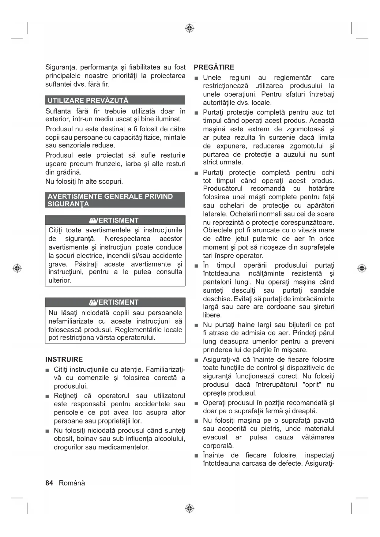 SIGURANŢA AVERTISMENT Citiţi toate avertismentele şi instrucţiunile de siguranţă. Nerespectarea acestor avertismente şi instrucţiuni poate conduce la şocuri electrice, incendii şi/sau accidente grave. Păstraţi aceste avertismente şi instrucţiuni, pentru a le putea consulta ulterior. AVERTISMENT Nu lăsaţi niciodată copiii sau persoanele nefamiliarizate cu aceste instrucţiuni să folosească produsul. Reglementările locale pot restricţiona vârsta operatorului. INSTRUIRE ■ Citiţi instrucţiunile cu atenţie. Familiarizaţi- vă cu comenzile şi folosirea corectă a produsului. ■ Reţineţi că operatorul sau utilizatorul este responsabil pentru accidentele sau pericolele ce pot avea loc asupra altor persoane sau proprietăţii lor. ■ Nu folosiţi niciodată produsul când sunteţi obosit, bolnav sau sub influenţa alcoolului, drogurilor sau medicamentelor. PREGĂTIRE ■ Unele regiuni au reglementări care restricţionează utilizarea produsului la unele operaţiuni. Pentru sfaturi întrebaţi autorităţile dvs. locale. ■ Purtaţi protecţie completă pentru auz tot timpul când operaţi acest produs. Această maşină este extrem de zgomotoasă şi ar putea rezulta în surzenie dacă limita de expunere, reducerea zgomotului şi purtarea de protecţie a auzului nu sunt strict urmate. ■ Purtaţi protecţie completă pentru ochi tot timpul când operaţi acest produs. Producătorul recomandă cu hotărâre folosirea unei măşti complete pentru faţă sau ochelari de protecţie cu apărători laterale. Ochelarii normali sau cei de soare nu reprezintă o protecţie corespunzătoare. Obiectele pot fi aruncate cu o viteză mare de către jetul puternic de aer în orice moment şi pot să ricoşeze din suprafeţele tari înspre operator. ■ În timpul operării produsului purtaţi întotdeauna incălţăminte rezistentă şi pantaloni lungi. Nu operaţi maşina când sunteţi desculţi sau purtaţi sandale deschise. Evitaţi să purtaţi de îmbrăcăminte largă sau care are cordoane sau şireturi libere. ■ Nu purtaţi haine largi sau bijuterii ce pot fi atrase de admisia de aer. Prindeţi părul lung deasupra umerilor pentru a preveni prinderea lui de părţile în mişcare. ■ Asiguraţi-vă că înainte de fiecare folosire toate funcţiile de control şi dispozitivele de siguranţă funcţionează corect. Nu folosiţi produsul dacă întrerupătorul "oprit" nu opreşte produsul. ■ Operaţi produsul în poziţia recomandată şi doar pe o suprafaţă fermă şi dreaptă. ■ Nu folosiţi maşina pe o suprafaţă pavată sau acoperită cu pietriş, unde materialul evacuat ar putea cauza vătămarea corporală. ■ Înainte de fiecare folosire, inspectaţi întotdeauna carcasa de defecte. Asiguraţi-85 Română |