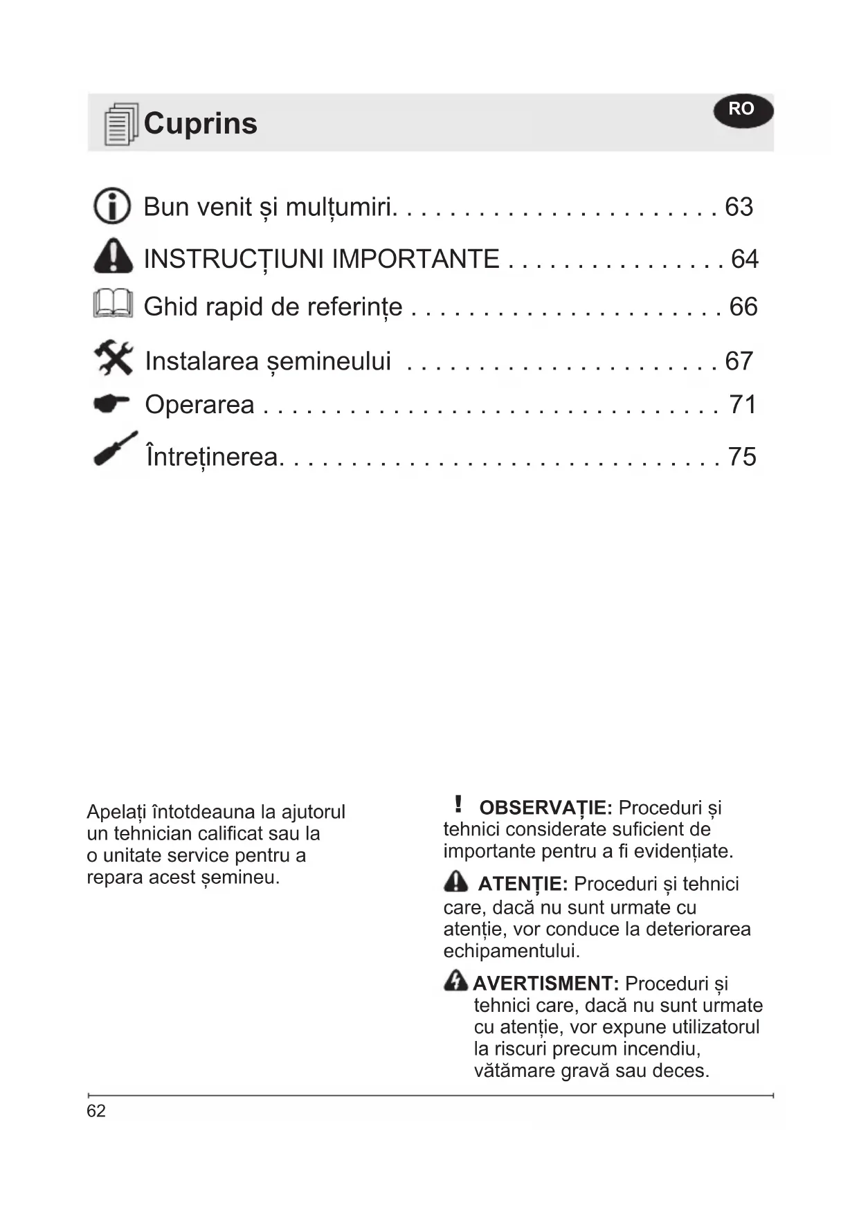 OBSERVAȚIE: Proceduri și tehnici considerate sucient de importante pentru a evidențiate. ATENȚIE: Proceduri și tehnici care, dacă nu sunt urmate cu atenție, vor conduce la deteriorarea echipamentului. AVERTISMENT: Proceduri și tehnici care, dacă nu sunt urmate cu atenție, vor expune utilizatorul la riscuri precum incendiu, vătămare gravă sau deces. Bun venit și mulțumiri. . . . . . . . . . . . . . . . . . . . . . . 63