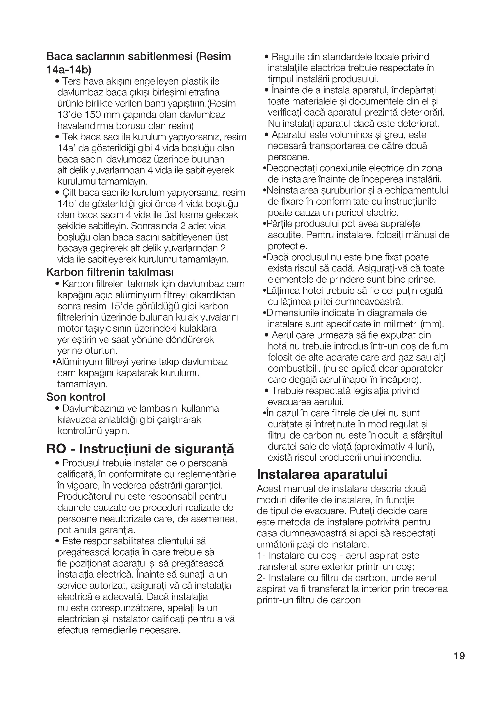 - Pentru instalarea cu filtru de carbon se va folosi un tub de aerisire a hotei cu diametrul de 150 mm. Tubul nu este furnizat împreună cu produsul şi trebuie să-l cumpărați dumneavoastră.