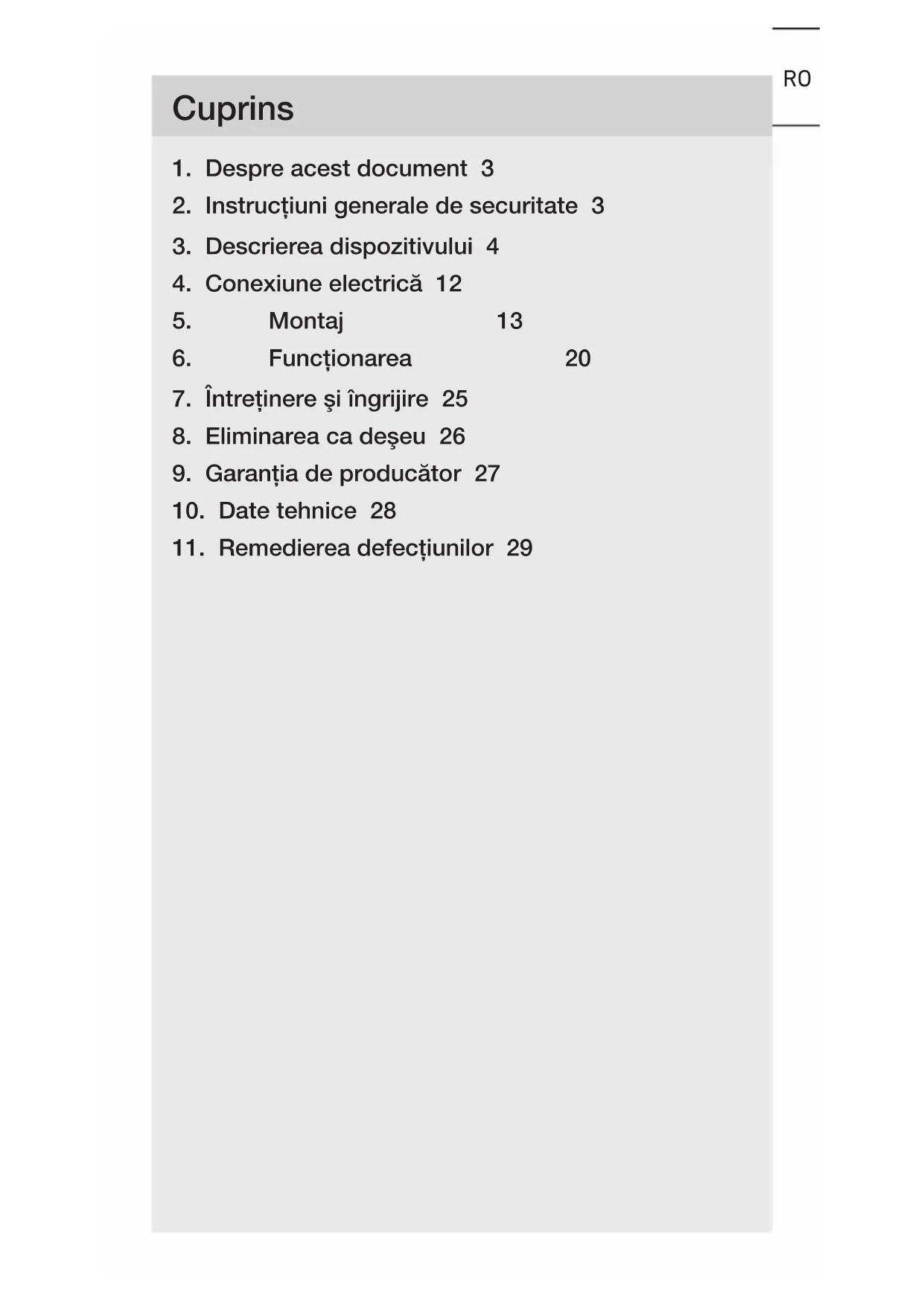 - Curăţaţi aparatul cu o lavetă uşor umezită, fără detergent. Important: Aparatul de comandă nu se poate înlocui.– 26 – Cuprins