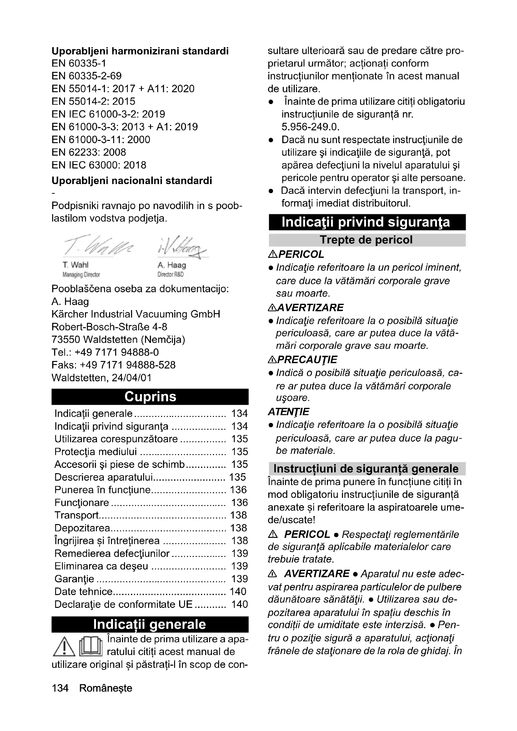 Podpisniki ravnajo po navodilih in s poob- lastilom vodstva podjetja. Pooblaščena oseba za dokumentacijo: A. Haag Kärcher Industrial Vacuuming GmbH Robert-Bosch-Straße 4-8 73550 Waldstetten (Nemčija) Tel.: +49 7171 94888-0 Faks: +49 7171 94888-528 Waldstetten, 24/04/01 Cuprins Indicații generale Înainte de prima utilizare a apa- ratului citiți acest manual de utilizare original și păstrați-l în scop de con- sultare ulterioară sau de predare către pro- prietarul următor; acționați conform instrucțiunilor menționate în acest manual de utilizare. ● Înainte de prima utilizare citiți obligatoriu instrucțiunile de siguranță nr.