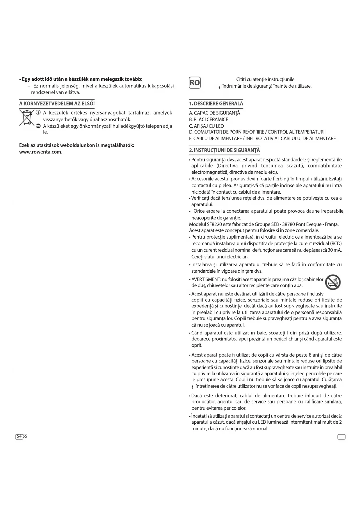 - Aparatul se oprește din încălzit după o anumită perioadă de timp: - Este normal, deoarece aparatul are un sistem de oprire automată. PROTECȚIA MEDIULUI PE PRIMUL PLAN! Aparatul dvs. conține materiale valoroase, care pot recuperate sau reciclate. Predați-l la un centru local de colectare a deșeurilor. Aceste instrucțiuni sunt disponibile și pe site-ul nostru web, www.rowenta.com.58 59 Преди употреба прочетете инструкциите внимателно, както и указанията за безопасност.