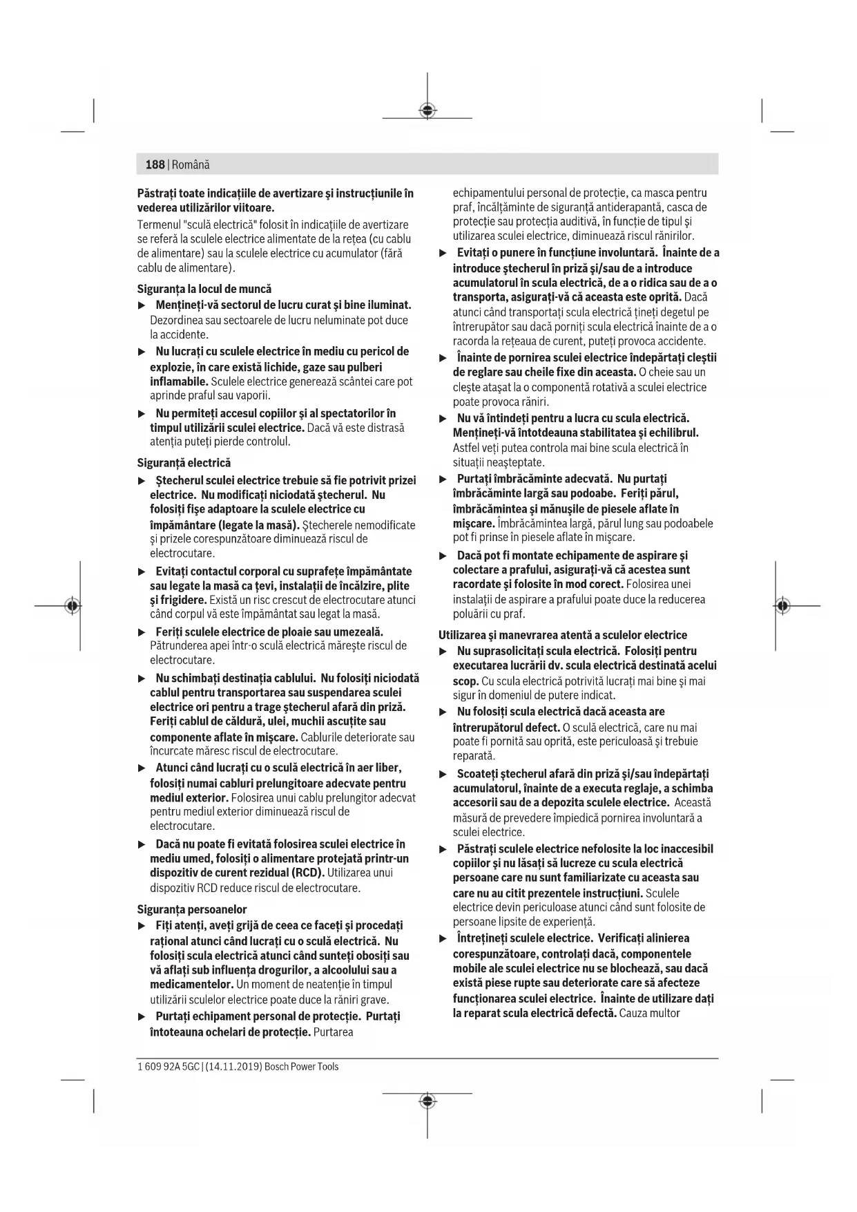 Бұл литий-иондық аккумуляторлар қауіпті тауарларға қойылатын талаптарға сай болуы керек. Пайдаланушы аккумуляторларды көшеде қосымша құжаттарсыз тасымалдай алады. Үшінші тұлғалар (мысалы, әуе көлігі немесе жіберу) орамаға және маркаларға қойылатын арнайы талаптарды сақтау керек. Жіберуге дайындау кезінде қауіпті жүктерді тасымалдау маманымен хабарласу керек. Аккумуляторды корпусы зақымдалған болса ғана жіберіңіз. Ашық түйіспелерді желімдеңіз және аккумуляторды орамада қозғалмайтындай ораңыз. Қажет болса, қосымша ұлттық ережелерді сақтаңыз. Кәдеге жарату Электр құралдарды, аккумуляторларды, керек-жарақтарды және орау материалдарын экологиялық тұрғыдан дұрыс утилизациялауға тапсыру керек. Электр құралдарды және аккумуляторларды/ батареяларды үй қоқысына тастамаңыз! Тек қана ЕО елдері үшін: Еуропа 2012/19/EU ережесі бойынша жарамсыз электр құралдары және Еуропа 2006/66/EC ережесі бойынша зақымдалған немесе ескі аккумулятор/батареялар бөлек жиналып кәдеге жаратылуы қажет. Аккумуляторлар/батареялар: Литий-иондық: Тасымалдау бөліміндегі нұсқауларды орындаңыз (қараңыз „Тасымалдау“, Бет187). Română Instrucţiuni de siguranţă Indicaţii generale de avertizare pentru scule electrice AVERTIS- MENT Citiţi toate indicaţiile de avertizare şi instrucţiunile. Nerespectarea indicaţiilor de avertizare şi a instrucţiunilor poate provoca electrocutare, incendii şi/sau răniri grave. Bosch Power Tools 1 609 92A 5GC | (14.11.2019)188 | Română Păstraţi toate indicaţiile de avertizare şi instrucţiunile în vederea utilizărilor viitoare. Termenul "sculă electrică" folosit în indicaţiile de avertizare se referă la sculele electrice alimentate de la reţea (cu cablu de alimentare) sau la sculele electrice cu acumulator (fără cablu de alimentare). Siguranţa la locul de muncă u Menţineţi‑vă sectorul de lucru curat şi bine iluminat. Dezordinea sau sectoarele de lucru neluminate pot duce la accidente. u Nu lucraţi cu sculele electrice în mediu cu pericol de explozie, în care există lichide, gaze sau pulberi inflamabile. Sculele electrice generează scântei care pot aprinde praful sau vaporii. u Nu permiteţi accesul copiilor şi al spectatorilor în timpul utilizării sculei electrice. Dacă vă este distrasă atenţia puteţi pierde controlul. Siguranţă electrică u Ştecherul sculei electrice trebuie să fie potrivit prizei electrice. Nu modificaţi niciodată ştecherul. Nu folosiţi fişe adaptoare la sculele electrice cu împământare (legate la masă). Ştecherele nemodificate şi prizele corespunzătoare diminuează riscul de electrocutare. u Evitaţi contactul corporal cu suprafeţe împământate sau legate la masă ca ţevi, instalaţii de încălzire, plite şi frigidere. Există un risc crescut de electrocutare atunci când corpul vă este împământat sau legat la masă. u Feriţi sculele electrice de ploaie sau umezeală. Pătrunderea apei într‑o sculă electrică măreşte riscul de electrocutare. u Nu schimbaţi destinaţia cablului. Nu folosiţi niciodată cablul pentru transportarea sau suspendarea sculei electrice ori pentru a trage ştecherul afară din priză. Feriţi cablul de căldură, ulei, muchii ascuţite sau componente aflate în mişcare. Cablurile deteriorate sau încurcate măresc riscul de electrocutare. u Atunci când lucraţi cu o sculă electrică în aer liber, folosiţi numai cabluri prelungitoare adecvate pentru mediul exterior. Folosirea unui cablu prelungitor adecvat pentru mediul exterior diminuează riscul de electrocutare. u Dacă nu poate fi evitată folosirea sculei electrice în mediu umed, folosiţi o alimentare protejată printr-un dispozitiv de curent rezidual (RCD). Utilizarea unui dispozitiv RCD reduce riscul de electrocutare. Siguranţa persoanelor u Fiţi atenţi, aveţi grijă de ceea ce faceţi şi procedaţi raţional atunci când lucraţi cu o sculă electrică. Nu folosiţi scula electrică atunci când sunteţi obosiţi sau vă aflaţi sub influenţa drogurilor, a alcoolului sau a medicamentelor. Un moment de neatenţie în timpul utilizării sculelor electrice poate duce la răniri grave. u Purtaţi echipament personal de protecţie. Purtaţi întoteauna ochelari de protecţie. Purtarea echipamentului personal de protecţie, ca masca pentru praf, încălţăminte de siguranţă antiderapantă, casca de protecţie sau protecţia auditivă, în funcţie de tipul şi utilizarea sculei electrice, diminuează riscul rănirilor. u Evitaţi o punere în funcţiune involuntară. Înainte de a introduce ştecherul în priză şi/sau de a introduce acumulatorul în scula electrică, de a o ridica sau de a o transporta, asiguraţi‑vă că aceasta este oprită. Dacă atunci când transportaţi scula electrică ţineţi degetul pe întrerupător sau dacă porniţi scula electrică înainte de a o racorda la reţeaua de curent, puteţi provoca accidente. u Înainte de pornirea sculei electrice îndepărtaţi cleştii de reglare sau cheile fixe din aceasta. O cheie sau un cleşte ataşat la o componentă rotativ