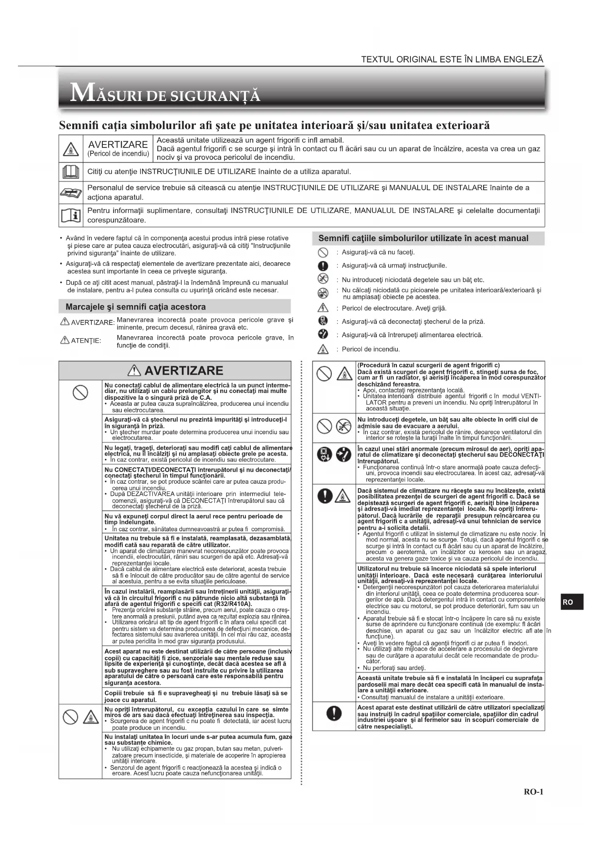 AVERTIZARE Nu conectaţi cablul de alimentare electrică la un punct interme-diar, nu utilizaţi un cablu prelungitor şi nu conectaţi mai multe dispozitive la o singură priză de C.A.• Aceasta ar putea cauza supraîncălzirea, producerea unui incendiu sau electrocutarea.Asiguraţi-vă că ştecherul nu prezintă impurităţi şi introduceţi-l în siguranţă în priză.• Un ştecher murdar poate determina producerea unui incendiu sau electrocutarea.Nu legaţi, trageţi, deterioraţi sau modifi caţi cablul de alimentare electrică, nu îl încălziţi şi nu amplasaţi obiecte grele pe acesta.• În caz contrar, există pericolul de incendiu sau electrocutare.Nu CONECTAŢI/DECONECTAŢI întrerupătorul şi nu deconectaţi/conectaţi ştecherul în timpul funcţionării.• În caz contrar, se pot produce scântei care ar putea cauza produ-cerea unui incendiu.• După DEZACTIVAREA unităţii interioare prin intermediul tele-comenzii, asiguraţi-vă că DECONECTAŢI întrerupătorul sau că deconectaţi ştecherul de la priză. Nu vă expuneţi corpul direct la aerul rece pentru perioade de timp îndelungate. În caz contrar, sănătatea dumneavoastră ar putea fi compromisă.Unitatea nu trebuie să fi e instalată, reamplasată, dezasamblată, modifi cată sau reparată de către utilizator.• Un aparat de climatizare manevrat necorespunzător poate provoca incendii, electrocutări, răniri sau scurgeri de apă etc. Adresaţi-vă reprezentanţei locale.• Dacă cablul de alimentare electrică este deteriorat, acesta trebuie să fi e înlocuit de către producător sau de către agentul de service al acestuia, pentru a se evita situaţiile periculoase.În cazul instalării, reamplasării sau întreținerii unităţii, asiguraţi-vă că în circuitul frigorifi c nu pătrunde nicio altă substanţă în afară de agentul frigorifi c specifi cat (R32/R410A). Prezenţa oricărei substanţe străine, precum aerul, poate cauza o creş-tere anormală a presiunii, putând avea ca rezultat explozia sau rănirea. Utilizarea oricărui alt tip de agent frigorifi c în afara celui specifi cat pentru sistem va determina producerea de defecţiuni mecanice, de-fectarea sistemului sau avarierea unităţii. În cel mai rău caz, aceasta ar putea periclita în mod grav siguranţa produsului.Acest aparat nu este destinat utilizării de către persoane (inclusiv copii) cu capacităţi fi zice, senzoriale sau mentale reduse sau lipsite de experienţă şi cunoştinţe, decât dacă acestea se afl ă sub supraveghere sau au fost instruite cu privire la utilizarea aparatului de către o persoană care este responsabilă pentru siguranţa acestora.Copiii trebuie să fi e supravegheaţi şi nu trebuie lăsaţi să se joace cu aparatul. Nu opriţi întrerupătorul, cu excepţia cazului în care se simte miros de ars sau dacă efectuaţi întreţinerea sau inspecţia.• Scurgerea de agent frigorifi c nu poate fi detectată, iar acest lucru poate produce un incendiu.Nu instalaţi unitatea în locuri unde s-ar putea acumula fum, gaze sau substanțe chimice. Nu utilizaţi echipamente cu gaz propan, butan sau metan, pulveri-zatoare precum insecticide, şi materiale de acoperire în apropierea unităţii interioare.• Senzorul de agent frigorifi c reacţionează la acestea şi indică o eroare. Acest lucru poate cauza nefuncţionarea unităţii.• Având în vedere faptul că în componenţa acestui produs intră piese rotative şi piese care ar putea cauza electrocutări, asiguraţi-vă că citiţi “Instrucţiunile privind siguranţa” înainte de utilizare.• Asiguraţi-vă că respectaţi elementele de avertizare prezentate aici, deoarece acestea sunt importante în ceea ce priveşte siguranţa.• După ce aţi citit acest manual, păstraţi-l la îndemână împreună cu manualul de instalare, pentru a-l putea consulta cu uşurinţă oricând este necesar. Marcajele şi semnifi caţia acestora AVERTIZARE:Manevrarea incorectă poate provoca pericole grave şi iminente, precum decesul, rănirea gravă etc. ATENŢIE:Manevrarea incorectă poate provoca pericole grave, în funcţie de condiţii. (Procedură în cazul scurgerii de agent frigorifi c)Dacă există scurgeri de agent frigorifi c, stingeţi sursa de foc, cum ar fi un radiator, şi aerisiţi încăperea în mod corespunzător deschizând fereastra.• Apoi, contactaţi reprezentanţa locală.• Unitatea interioară distribuie agentul frigorifi c în modul VENTI-LATOR pentru a preveni un incendiu. Nu opriţi întrerupătorul în această situaţie. Nu introduceţi degetele, un băţ sau alte obiecte în orifi ciul de admisie sau de evacuare a aerului.• În caz contrar, există pericolul de rănire, deoarece ventilatorul din interior se roteşte la turaţii înalte în timpul funcţionării. În cazul unei stări anormale (precum mirosul de aer), opriţi apa-ratul de climatizare şi deconectaţi ştecherul sau DECONECTAŢI întrerupătorul.• Funcţionarea continuă într-o stare anormală poate cauza defecţi-uni, provoca incendii sau electrocutarea. În acest caz, adresaţi-vă reprezentanţei locale. Dacă sistemul de climatizare nu răceşte sau nu încălzeşte, există posibilitatea prezenţei de scurgeri de agent frigorifi c. Dacă se depistează scurgeri de agent frigorifi c, aerisiţi bine încăperea şi adresaţi-vă imediat reprezentanţei locale. Nu opriţi întreru-pătorul. Dacă lucrările de reparaţii presupun reîncărcarea cu agent frigorifi c a unităţii, adresaţi-vă unui tehnician de service pentru a-i solicita detalii.• Agentul frigorifi c utilizat în sistemul de climatizare nu este nociv. În mod normal, acesta nu se scurge. Totuşi, dacă agentul frigorifi c se scurge şi intră în contact cu fl ăcări sau cu un aparat de încălzire, precum o aerotermă, un încălzitor cu kerosen sau un aragaz, acesta va genera gaze toxice şi va cauza pericolul de incendiu.Utilizatorul nu trebuie să încerce niciodată s