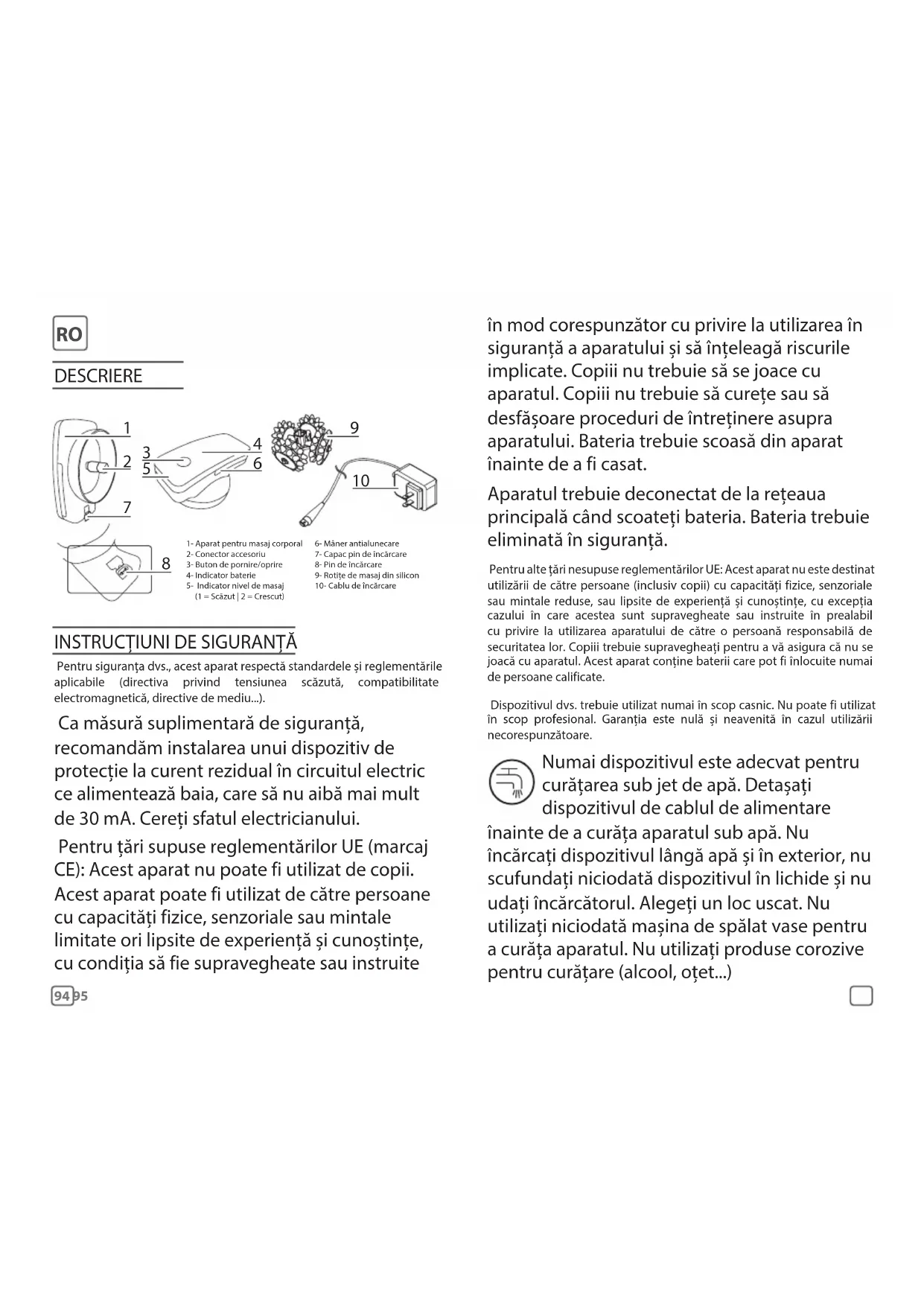 Pentru siguranța dvs., acest aparat respectă standardele și reglementările aplicabile (directiva privind tensiunea scăzută, compatibilitate electromagnetică, directive de mediu...). Ca măsură suplimentară de siguranță, recomandăm instalarea unui dispozitiv de protecție la curent rezidual în circuitul electric ce alimentează baia, care să nu aibă mai mult de 30 mA. Cereți sfatul electricianului. Pentru țări supuse reglementărilor UE (marcaj CE): Acest aparat nu poate fi utilizat de copii. Acest aparat poate fi utilizat de către persoane cu capacități fizice, senzoriale sau mintale limitate ori lipsite de experiență și cunoștințe, cu condiția să fie supravegheate sau instruite 1- Aparat pentru masaj corporal2- Conector accesoriu3- Buton de pornire/oprire4- Indicator baterie5- Indicator nivel de masaj (1 = Scăzut | 2 = Crescut)6- Mâner antialunecare7- Capac pin de încărcare8- Pin de încărcare9- Rotițe de masaj din silicon 10- Cablu de încărcare