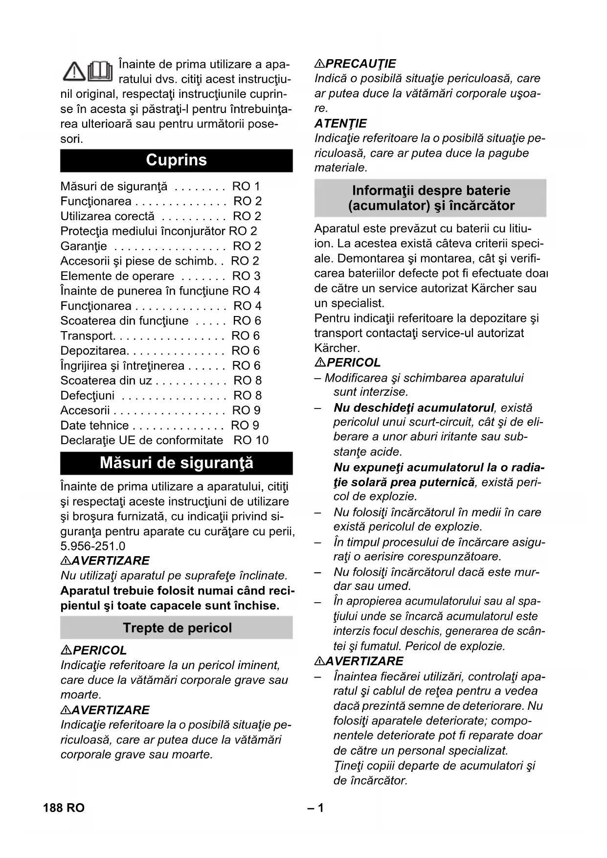 În apropierea acumulatorului sau al spa- ţiului unde se încarcă acumulatorul este interzis focul deschis, generarea de scân- tei şi fumatul. Pericol de explozie. 몇 AVERTIZARE – Înaintea fiecărei utilizări, controlaţi apa- ratul şi cablul de reţea pentru a vedea dacă prezintă semne de deteriorare. Nu folosiţi aparatele deteriorate; compo- nentele deteriorate pot fi reparate doar de către un personal specializat. Ţineţi copiii departe de acumulatori şi de încărcător. Cuprins Măsuri de siguranţă . . . . . . . . RO 1 Funcţionarea . . . . . . . . . . . . . . RO 2 Utilizarea corectă . . . . . . . . . . RO 2 Protecţia mediului înconjurător RO 2 Garanţie . . . . . . . . . . . . . . . . . RO 2 Accesorii şi piese de schimb. . RO 2 Elemente de operare . . . . . . . RO 3 Înainte de punerea în funcţiune RO 4 Funcţionarea . . . . . . . . . . . . . . RO 4 Scoaterea din funcţiune . . . . . RO 6 Transport. . . . . . . . . . . . . . . . . RO 6 Depozitarea. . . . . . . . . . . . . . . RO 6 Îngrijirea şi întreţinerea . . . . . . RO 6 Scoaterea din uz . . . . . . . . . . . RO 8 Defecţiuni . . . . . . . . . . . . . . . . RO 8 Accesorii . . . . . . . . . . . . . . . . . RO 9 Date tehnice . . . . . . . . . . . . . . RO 9 Declaraţie UE de conformitate RO 10 Măsuri de siguranţă Trepte de pericol Informaţii despre baterie (acumulator) şi încărcător 188 RO– 2 Nu încărcaţi bateriile deteriorate. Înlo- cuiţi bateriile deteriorate la un service autorizat Kärcher. – Nu aruncaţi bateriile defecte în gunoiul menajer, anunţaţi service-ul autorizat Kärcher. – Evitaţi contactul cu lichidul scurs din acumulatorii defecţi. În cazul unui con- tact accidental, spălaţi lichidul cu apă. În cazul în care lichidul vine în contact cu ochii, mergeţi la un medic. 몇 PRECAUŢIE – Respectaţi cu stricteţe aceste instrucţi- uni de operare. Ţineţi cont şi de regle- mentările în vigoare referitoare la mani- pularea bateriilor. – Tensiunea de alimentare trebuie să co- respundă tensiunii indicate pe plăcuţa de tip a aparatului. – Folosiţi încărcătorul numai pentru încăr- carea acumulatorilor aprobaţi.
