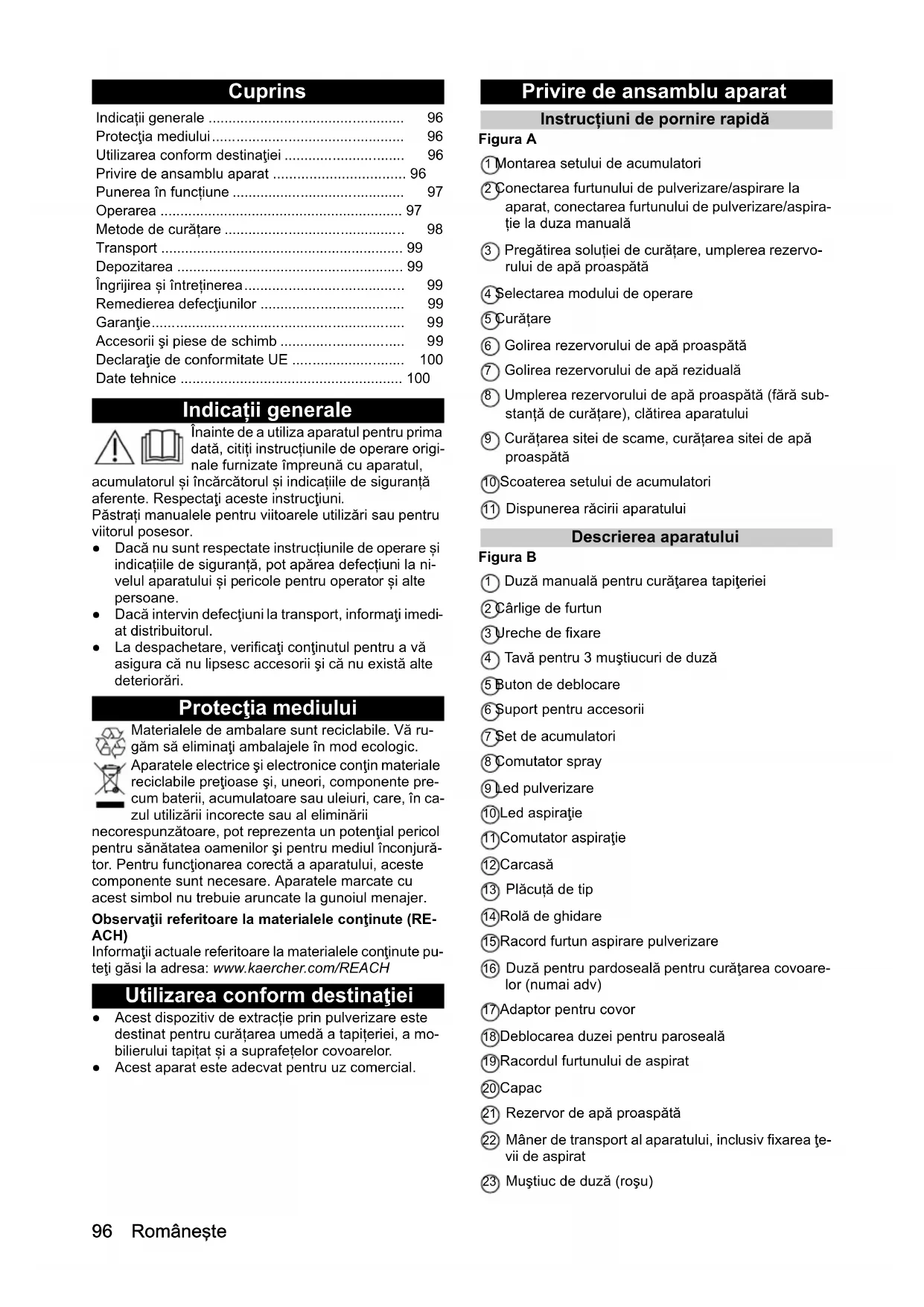 - 0,296 Româneşte Cuprins Indicații generale Înainte de a utiliza aparatul pentru prima dată, citiți instrucțiunile de operare origi- nale furnizate împreună cu aparatul, acumulatorul și încărcătorul și indicațiile de siguranță aferente. Respectaţi aceste instrucţiuni. Păstrați manualele pentru viitoarele utilizări sau pentru viitorul posesor. ● Dacă nu sunt respectate instrucțiunile de operare și indicațiile de siguranță, pot apărea defecțiuni la ni- velul aparatului și pericole pentru operator și alte persoane. ● Dacă intervin defecţiuni la transport, informaţi imedi- at distribuitorul. ● La despachetare, verificaţi conţinutul pentru a vă asigura că nu lipsesc accesorii şi că nu există alte deteriorări. Protecţia mediului Materialele de ambalare sunt reciclabile. Vă ru- găm să eliminaţi ambalajele în mod ecologic. Aparatele electrice şi electronice conţin materiale reciclabile preţioase şi, uneori, componente pre- cum baterii, acumulatoare sau uleiuri, care, în ca- zul utilizării incorecte sau al eliminării necorespunzătoare, pot reprezenta un potenţial pericol pentru sănătatea oamenilor şi pentru mediul înconjură- tor. Pentru funcţionarea corectă a aparatului, aceste componente sunt necesare. Aparatele marcate cu acest simbol nu trebuie aruncate la gunoiul menajer. Observaţii referitoare la materialele conţinute (RE- ACH) Informaţii actuale referitoare la materialele conţinute pu- teţi găsi la adresa: www.kaercher.com/REACH Utilizarea conform destinaţiei ● Acest dispozitiv de extracție prin pulverizare este destinat pentru curățarea umedă a tapițeriei, a mo- bilierului tapițat și a suprafețelor covoarelor. ● Acest aparat este adecvat pentru uz comercial. Privire de ansamblu aparat Instrucțiuni de pornire rapidă Figura A 1 Montarea setului de acumulatori 2 Conectarea furtunului de pulverizare/aspirare la aparat, conectarea furtunului de pulverizare/aspira- ție la duza manuală 3 Pregătirea soluției de curățare, umplerea rezervo- rului de apă proaspătă 4 Selectarea modului de operare 5 Curățare 6 Golirea rezervorului de apă proaspătă 7 Golirea rezervorului de apă reziduală 8 Umplerea rezervorului de apă proaspătă (fără sub- stanță de curățare), clătirea aparatului 9 Curățarea sitei de scame, curățarea sitei de apă proaspătă 10 Scoaterea setului de acumulatori 11 Dispunerea răcirii aparatului Descrierea aparatului Figura B 1 Duză manuală pentru curăţarea tapiţeriei 2 Cârlige de furtun 3 Ureche de fixare 4 Tavă pentru 3 muştiucuri de duză 5 Buton de deblocare 6 Suport pentru accesorii 7 Set de acumulatori 8 Comutator spray 9 Led pulverizare 10 Led aspiraţie 11 Comutator aspiraţie 12 Carcasă 13 Plăcuță de tip 14 Rolă de ghidare 15 Racord furtun aspirare pulverizare 16 Duză pentru pardoseală pentru curăţarea covoare- lor (numai adv) 17 Adaptor pentru covor 18 Deblocarea duzei pentru paroseală 19 Racordul furtunului de aspirat 20 Capac 21 Rezervor de apă proaspătă 22 Mâner de transport al aparatului, inclusiv fixarea ţe- vii de aspirat 23 Muştiuc de duză (roşu) Indicații generale p. 96