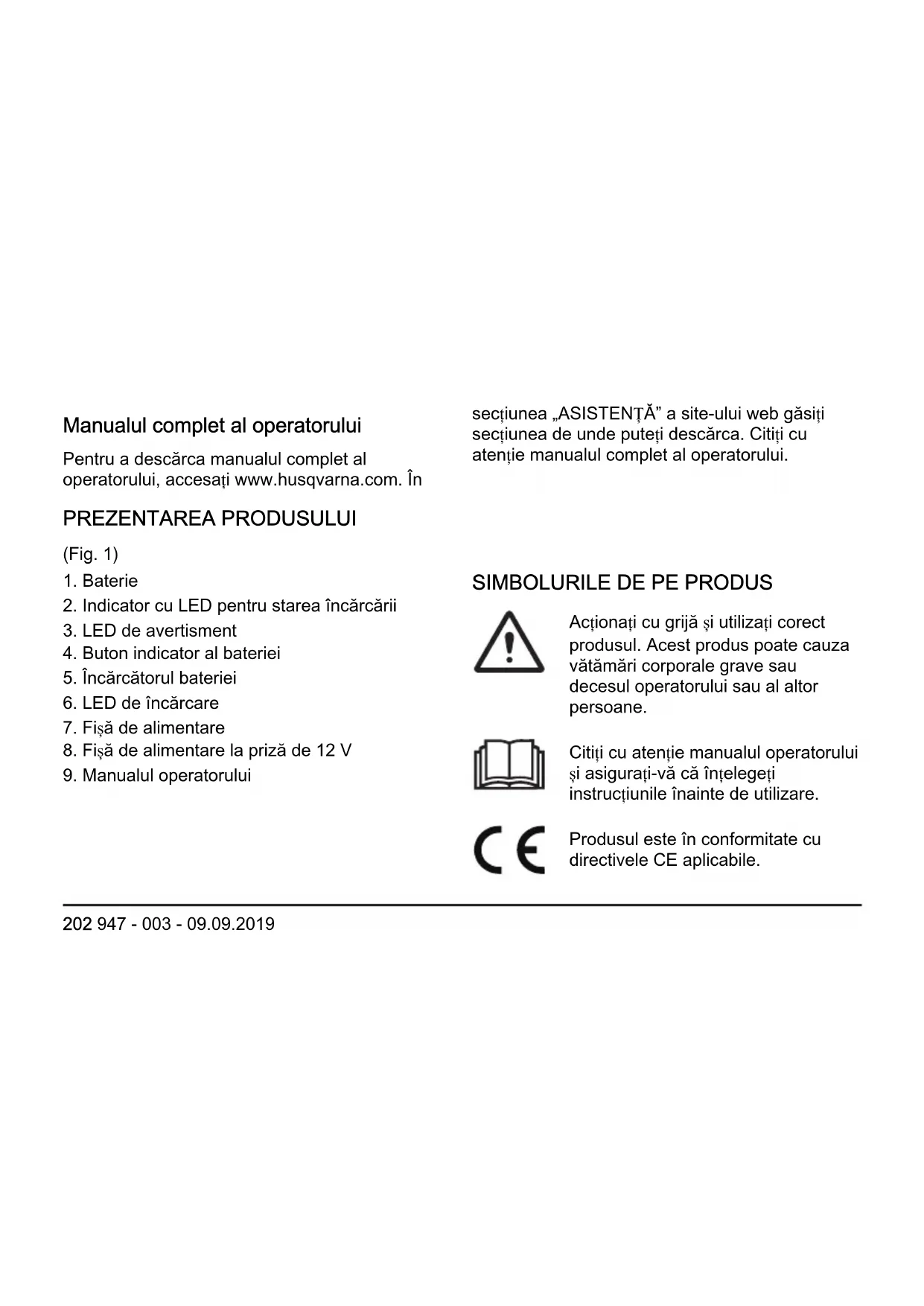 Acționați cu grijă și utilizați corect produsul. Acest produs poate cauza vătămări corporale grave sau decesul operatorului sau al altor persoane. Citiți cu atenție manualul operatorului și asigurați-vă că înțelegeți instrucțiunile înainte de utilizare. Produsul este în conformitate cu directivele CE aplicabile. 202 947 - 003 - 09.09.2019Produsul și ambalajul produsului nu pot fi tratate ca deșeuri menajere. Reciclați-l la o locație de eliminare aprobată pentru echipamente electrice și electronice. Feriți unitatea de apă și ploaie. Utilizați și păstrați încărcătorul bateriei numai în interior. Nota: Alte simboluri/autocolante de pe produs se referă la cerințele de certificare pentru unele zone comerciale.