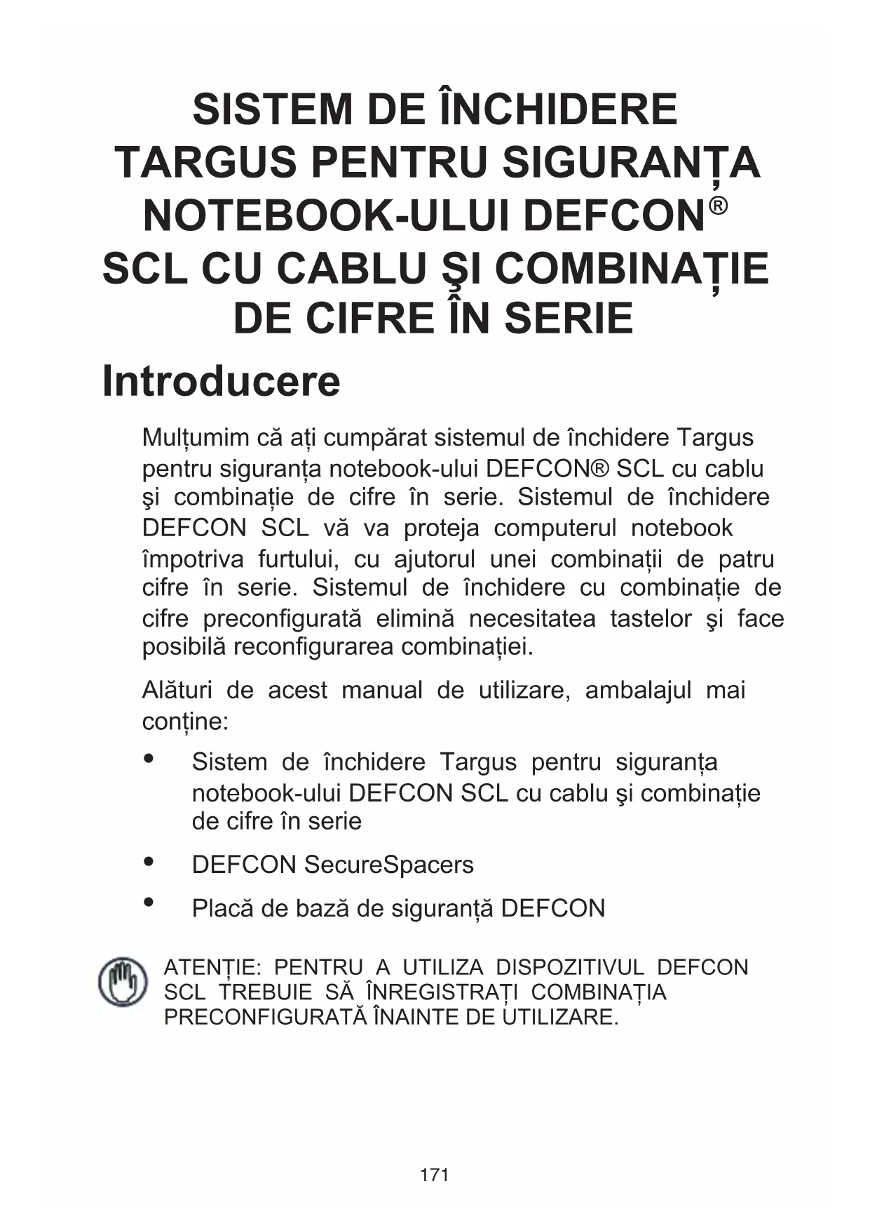 Introducere Mulţumim că aţi cumpărat sistemul de închidere Targus pentru siguranţa notebook-ului DEFCON® SCL cu cablu şi combinaţie de cifre în serie. Sistemul de închidere DEFCON SCL vă va proteja computerul notebook împotriva furtului, cu ajutorul unei combinaţii de patru cifre în serie. Sistemul de închidere cu combinaţie de cifre precongurată elimină necesitatea tastelor şi face posibilă recongurarea combinaţiei. Alături de acest manual de utilizare, ambalajul mai conţine: Sistem de închidere Targus pentru siguranţa notebook-ului DEFCON SCL cu cablu şi combinaţie de cifre în serie DEFCON SecureSpacers Placă de bază de siguranţă DEFCON ATENŢIE: PENTRU A UTILIZA DISPOZITIVUL DEFCON SCL TREBUIE SĂ ÎNREGISTRAŢI COMBINAŢIA PRECONFIGURATĂ ÎNAINTE DE UTILIZARE.
