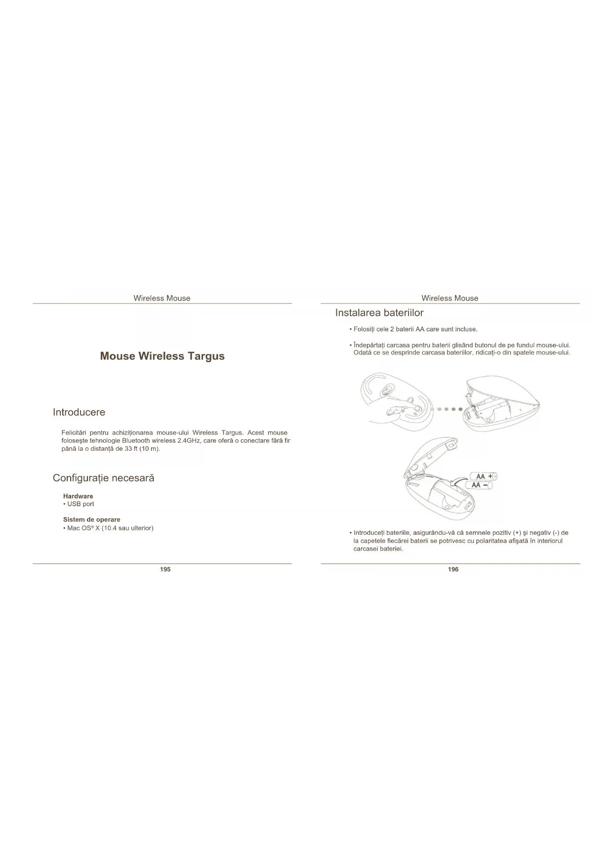 Mouse Wireless Targus Felicitări pentru achiziţionarea mouse-ului Wireless Targus. Acest mouse foloseşte tehnologie Bluetooth wireless 2.4GHz, care oferă o conectare fără r până la o distanţă de 33 ft (10 m). Introducere Conguraţie necesară Hardware