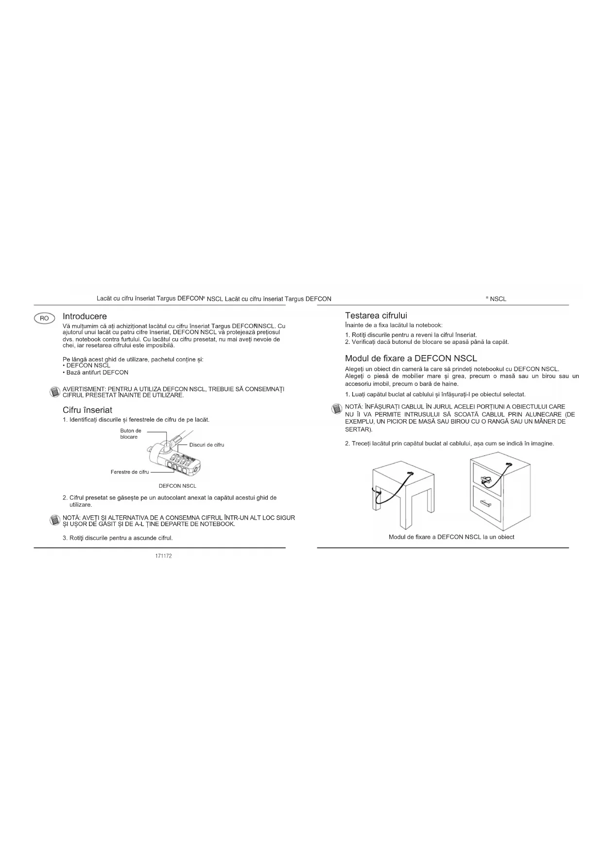 NSCL Introducere Vă mulțumim că ați achiziționat lacătul cu cifru înseriat Targus DEFCON