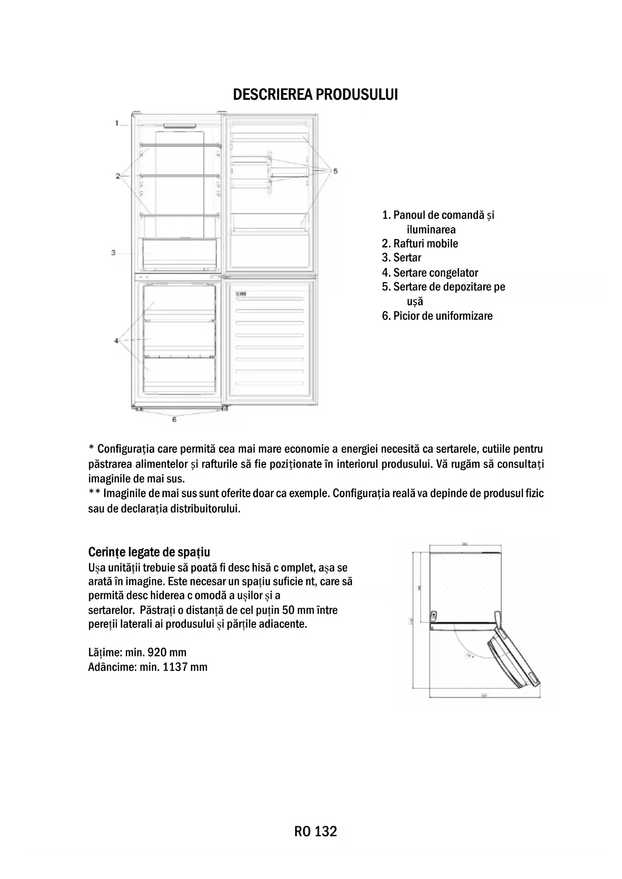 - Configurația care permită cea mai mare economie a energiei necesită ca sertarele, cutiile pentru păstrarea alimentelor și rafturile să fie poziționate în interiorul produsului. Vă rugăm să consultați imaginile de mai sus. ** Imaginile de mai sus sunt oferite doar ca exemple. Configurația reală va depinde de produsul fizic sau de declarația distribuitorului. Cerințe legate de spațiu Ușa unității trebuie să poată fi desc hisă c omplet, așa se arată în imagine. Este nec esar un spațiu suficie nt, care să permită desc hiderea c omodă a ușilor și a sertarelor. Păstrați o distanță de cel puțin 50 mm între pereții laterali ai produsului și părțile adiacente. Lățime: min. 920 mm Adâncime: min. 1137 mmRO 133 UTILIZAREA