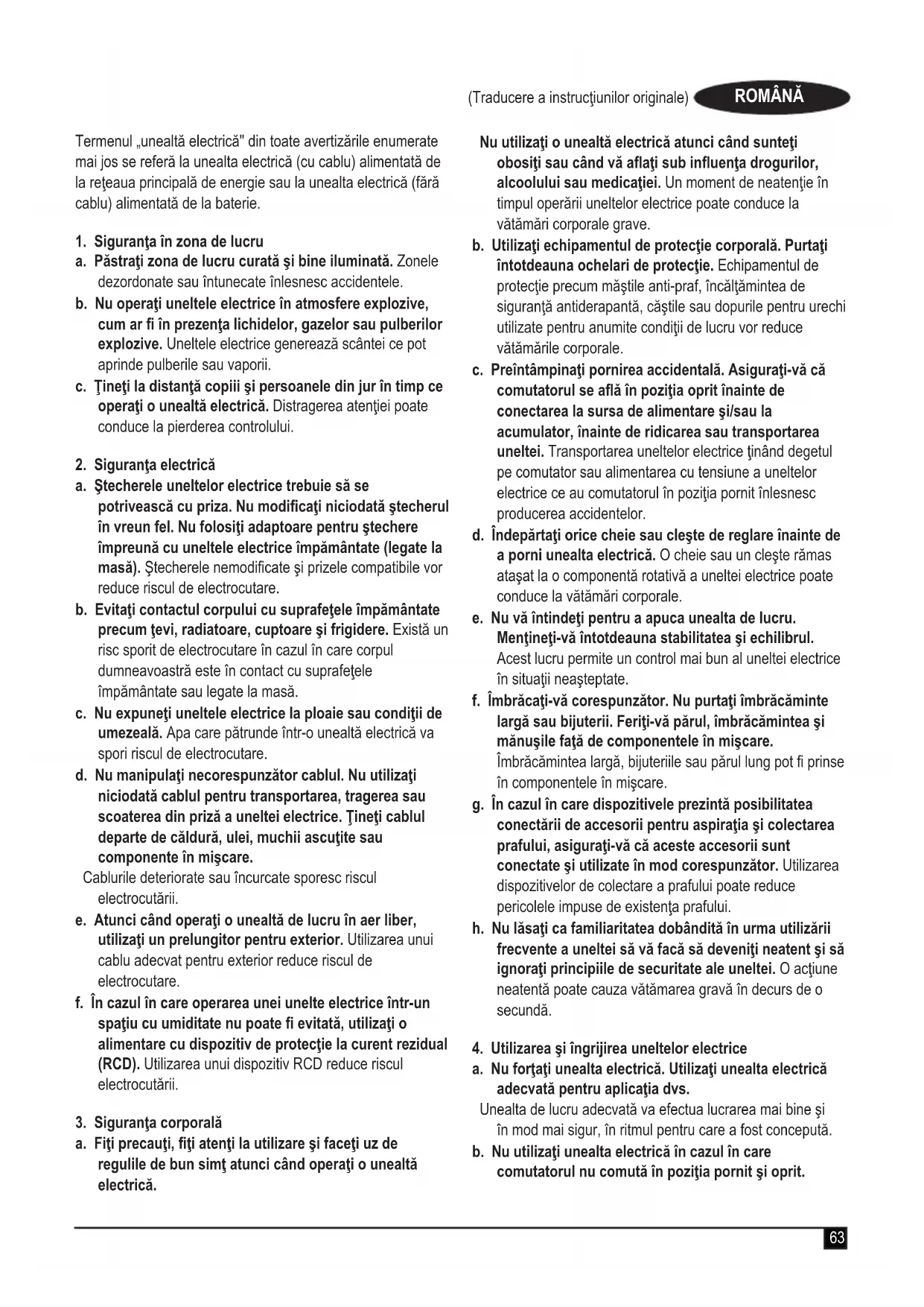 Avertisment! Citiţi toate avertizările de siguranţă, instrucţiunile, ilustraţiile şi specicaţiile furnizate împreună cu această unealtă electrică. Neres-pectarea avertizărilor şi a instrucţiunilor enumera-te în continuare poate conduce la electrocutare, incendii şi/sau vătămări grave.Păstraţi toate avertizările şi instrucţiunile pentru consultare ulterioară. ROMÂNĂ (Traducere a instrucţiunilor originale)63 ROMÂNĂ (Traducere a instrucţiunilor originale) Termenul „unealtă electrică" din toate avertizările enumerate mai jos se referă la unealta electrică (cu cablu) alimentată de la reţeaua principală de energie sau la unealta electrică (fără cablu) alimentată de la baterie.