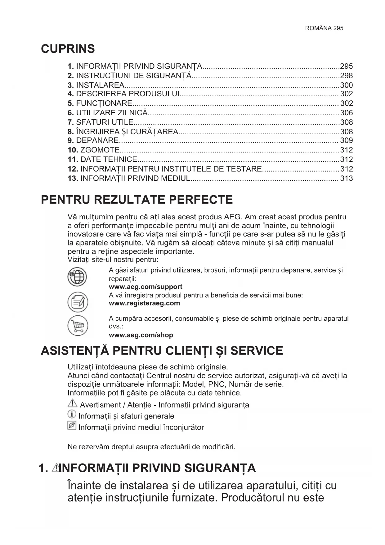 Vă mulțumim pentru că ați ales acest produs AEG. Am creat acest produs pentru a oferi performanțe impecabile pentru mulți ani de acum înainte, cu tehnologii inovatoare care vă fac viața mai simplă - funcții pe care s-ar putea să nu le găsiți la aparatele obișnuite. Vă rugăm să alocați câteva minute și să citiți manualul pentru a reține aspectele importante. Vizitați site-ul nostru pentru: A găsi sfaturi privind utilizarea, broșuri, informații pentru depanare, service și reparații: www.aeg.com/support A vă înregistra produsul pentru a beneficia de servicii mai bune: www.registeraeg.com A cumpăra accesorii, consumabile și piese de schimb originale pentru aparatul dvs.: www.aeg.com/shop