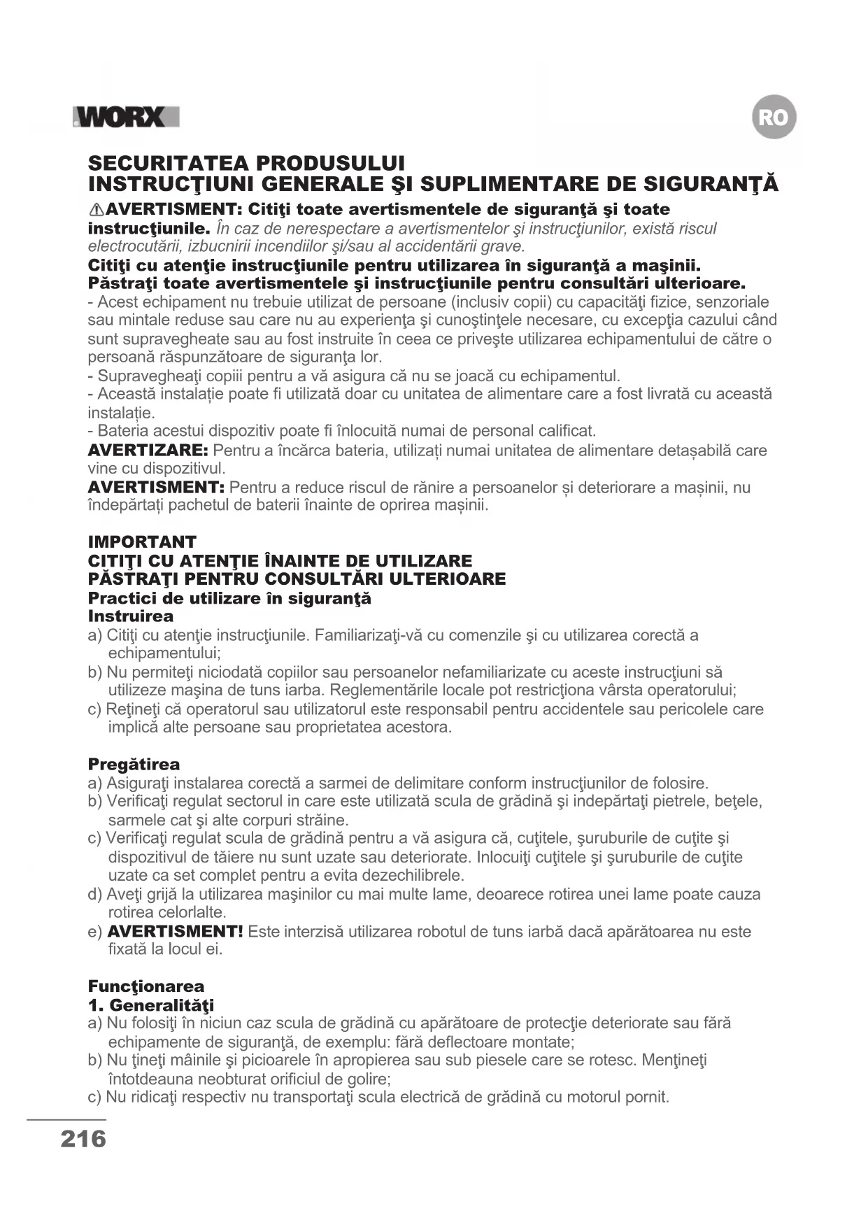 SECURITATEA PRODUSULUI INSTRUCŢIUNI GENERALE ŞI SUPLIMENTARE DE SIGURANŢĂ AVERTISMENT: Citiţi toate avertismentele de siguranţă şi toate instrucţiunile. În caz de nerespectare a avertismentelor şi instrucţiunilor, există riscul electrocutării, izbucnirii incendiilor şi/sau al accidentării grave. Citiţi cu atenţie instrucţiunile pentru utilizarea în siguranţă a maşinii. Păstraţi toate avertismentele şi instrucţiunile pentru consultări ulterioare. - Acest echipament nu trebuie utilizat de persoane (inclusiv copii) cu capacităţi zice, senzoriale sau mintale reduse sau care nu au experienţa şi cunoştinţele necesare, cu excepţia cazului când sunt supravegheate sau au fost instruite în ceea ce priveşte utilizarea echipamentului de către o persoană răspunzătoare de siguranţa lor. - Supravegheaţi copiii pentru a vă asigura că nu se joacă cu echipamentul. - Această instalație poate utilizată doar cu unitatea de alimentare care a fost livrată cu această instalație. - Bateria acestui dispozitiv poate înlocuită numai de personal calicat. AVERTIZARE: Pentru a încărca bateria, utilizați numai unitatea de alimentare detașabilă care vine cu dispozitivul. AVERTISMENT: Pentru a reduce riscul de rănire a persoanelor și deteriorare a mașinii, nu îndepărtați pachetul de baterii înainte de oprirea mașinii. IMPORTANT CITIŢI CU ATENŢIE ÎNAINTE DE UTILIZARE PĂSTRAŢI PENTRU CONSULTĂRI ULTERIOARE Practici de utilizare în siguranţă Instruirea a) Citiţi cu atenţie instrucţiunile. Familiarizaţi-vă cu comenzile şi cu utilizarea corectă a echipamentului; b) Nu permiteţi niciodată copiilor sau persoanelor nefamiliarizate cu aceste instrucţiuni să utilizeze maşina de tuns iarba. Reglementările locale pot restricţiona vârsta operatorului; c) Reţineţi că operatorul sau utilizatorul este responsabil pentru accidentele sau pericolele care implică alte persoane sau proprietatea acestora. Pregătirea a) Asiguraţi instalarea corectă a sarmei de delimitare conform instrucţiunilor de folosire. b) Vericaţi regulat sectorul in care este utilizată scula de grădină şi indepărtaţi pietrele, beţele, sarmele cat şi alte corpuri străine. c) Vericaţi regulat scula de grădină pentru a vă asigura că, cuţitele, şuruburile de cuţite şi dispozitivul de tăiere nu sunt uzate sau deteriorate. Inlocuiţi cuţitele şi şuruburile de cuţite uzate ca set complet pentru a evita dezechilibrele. d) Aveţi grijă la utilizarea maşinilor cu mai multe lame, deoarece rotirea unei lame poate cauza rotirea celorlalte. e) AVERTISMENT! Este interzisă utilizarea robotul de tuns iarbă dacă apărătoarea nu este xată la locul ei. Funcţionarea