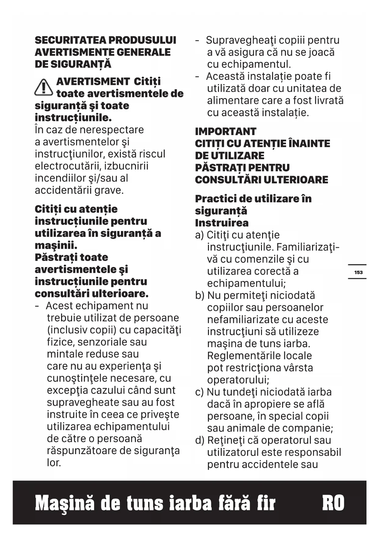 Practici de utilizare în siguranţă Instruirea a) Citiţi cu atenţie instrucţiunile. Familiarizaţi- vă cu comenzile şi cu utilizarea corectă a echipamentului; b) Nu permiteţi niciodată copiilor sau persoanelor nefamiliarizate cu aceste instrucţiuni să utilizeze maşina de tuns iarba. Reglementările locale pot restricţiona vârsta operatorului; c) Nu tundeţi niciodată iarba dacă în apropiere se află persoane, în special copii sau animale de companie; d) Reţineţi că operatorul sau utilizatorul este responsabil pentru accidentele sau154 Maşină de tuns iarba fără fir RO pericolele care implică alte persoane sau proprietatea acestora. Pregătirea a) În timp ce tundeţi iarba, purtaţi întotdeauna încălţăminte solidă şi pantaloni lungi. Nu acţionaţi echipamentul cu picioarele goale sau cu sandale; b) Inspectaţi cu atenţie zona în care va fi utilizat echipamentul şi îndepărtaţi toate obiectele care pot fi proiectate de către maşină; c) Înainte de utilizare, inspectaţi întotdeauna vizual lamele, şuruburile de lamă şi ansamblul de cuţite pentru a vă asigura că nu sunt uzate sau deteriorate. Înlocuiţi toate lamele şi şuruburile deteriorate sau uzate pentru a menţine echilibrarea maşinii.; Înlocuiţi etichetele deteriorate sau ilizibile. Funcţionarea a) Operaţi maşina doar la lumina zilei sau la o lumină artificială puternică; b) Evitaţi utilizarea echipamentului pe iarbă udă, dacă acest lucru este posibil; c) Acordaţi întotdeauna atenţie atunci când vă deplasaţi pe suprafeţe înclinate; d) Mergeţi, nu alergaţi niciodată; e) În cazul maşinilor rotative cu roţi, tundeţi iarba de-a lungul pantei, niciodată în sus sau în jos; f) Acordaţi atenţie maximă când schimbaţi direcţia pe pante; g) Nu tundeţi iarba pe pante excesiv de abrupte; h) Acordaţi atenţie maximă când vă deplasaţi în marşarier sau când trageţi maşina de tuns iarba către dvs.;