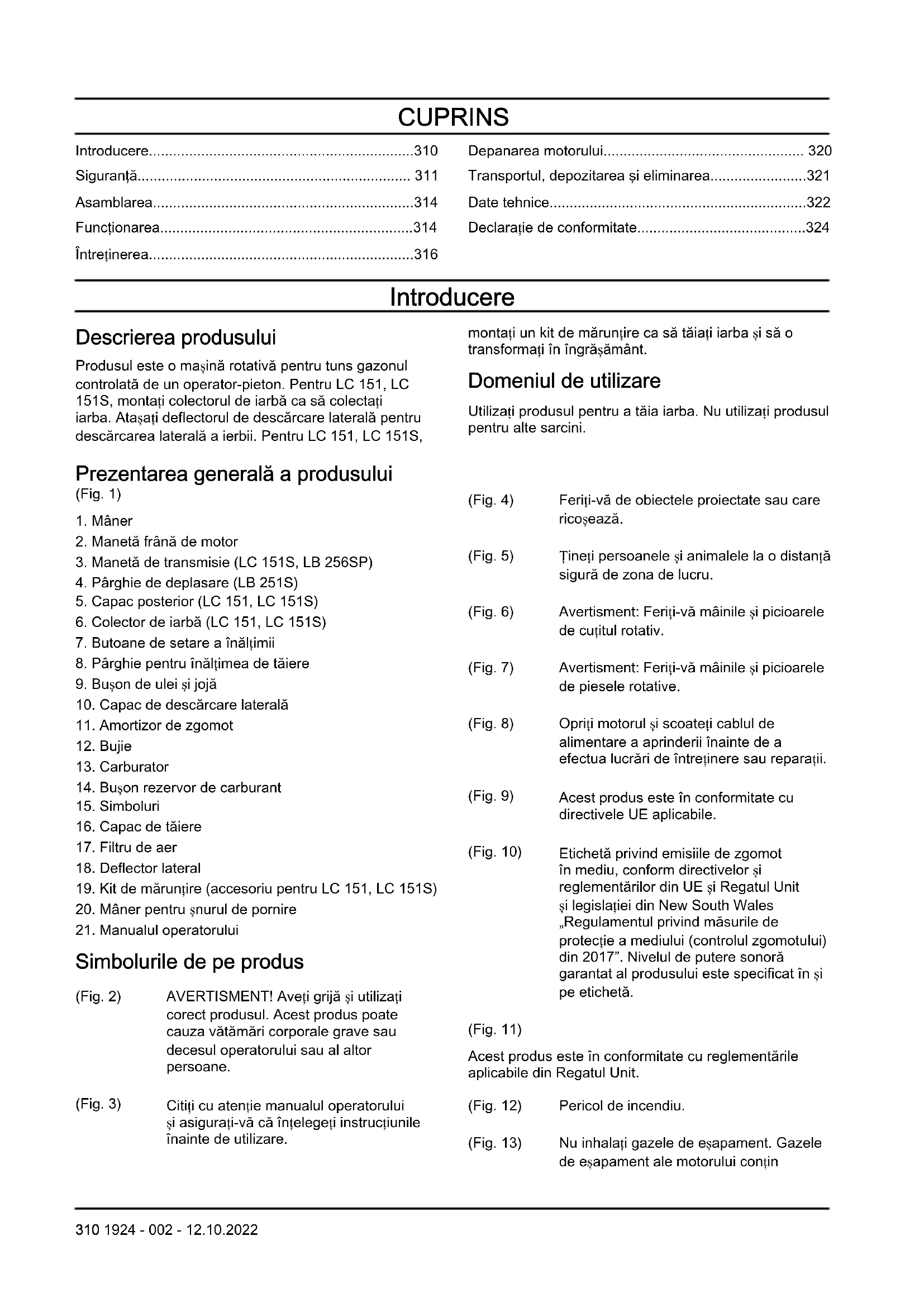Simbolurile de pe produs (Fig. 2) AVERTISMENT! Aveți grijă și utilizați corect produsul. Acest produs poate cauza vătămări corporale grave sau decesul operatorului sau al altor persoane. (Fig. 3) Citiți cu atenție manualul operatorului și asigurați-vă că înțelegeți instrucțiunile înainte de utilizare. (Fig. 4) Feriți-vă de obiectele proiectate sau care ricoșează. (Fig. 5) Țineți persoanele și animalele la o distanță sigură de zona de lucru. (Fig. 6) Avertisment: Feriți-vă mâinile și picioarele de cuțitul rotativ. (Fig. 7) Avertisment: Feriți-vă mâinile și picioarele de piesele rotative. (Fig. 8) Opriți motorul și scoateți cablul de alimentare a aprinderii înainte de a efectua lucrări de întreținere sau reparații. (Fig. 9) Acest produs este în conformitate cu directivele UE aplicabile. (Fig. 10) Etichetă privind emisiile de zgomot în mediu, conform directivelor și reglementărilor din UE și Regatul Unit și legislației din New South Wales „Regulamentul privind măsurile de protecție a mediului (controlul zgomotului) din 2017”. Nivelul de putere sonoră garantat al produsului este specificat în și pe etichetă. (Fig. 11) Acest produs este în conformitate cu reglementările aplicabile din Regatul Unit. (Fig. 12) Pericol de incendiu. (Fig. 13) Nu inhalați gazele de eșapament. Gazele de eșapament ale motorului conțin 310 1924 - 002 - 12.10.2022monoxid de carbon, care este un gaz inodor, toxic și deosebit de periculos. Nu porniți motorul în interior sau în spații închise. (Fig. 14) Suprafață fierbinte. (Fig. 15) Umpleți motorul cu ulei înainte de a porni produsul. Nota: Alte simboluri/autocolante de pe produs se referă la cerințele de certificare pentru unele zone comerciale. Răspunderea pentru produs Conform prevederilor legislației privind răspunderea pentru produs, nu ne asumăm răspunderea pentru daunele cauzate de produsul nostru dacă: