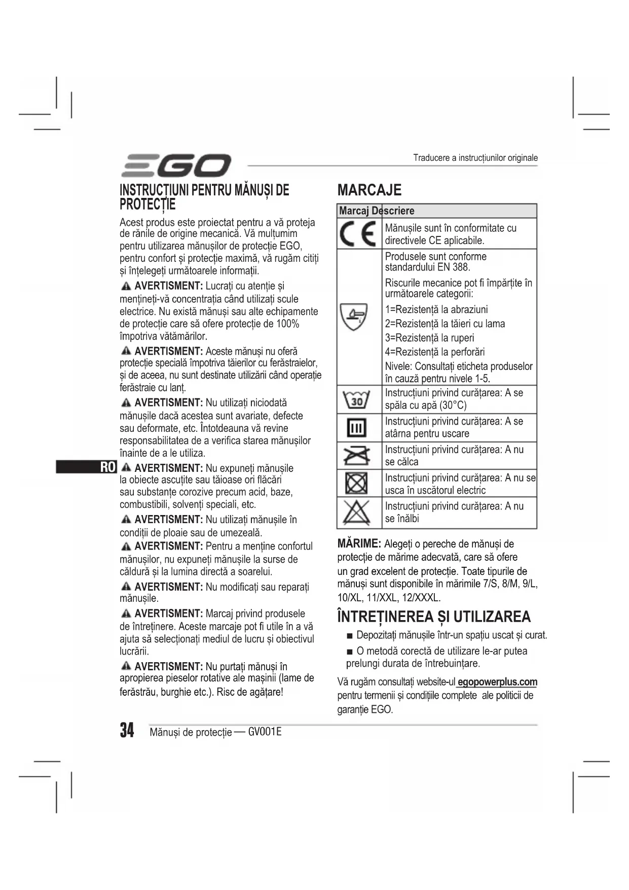 ■ Depozitați mănușile într-un spațiu uscat și curat. ■ O metodă corectă de utilizare le-ar putea prelungi durata de întrebuințare. Vă rugăm consultați website-ul egopowerplus.com pentru termenii și condițiile complete ale politicii de garanție EGO. Traducere a instrucțiunilor originaleRO Mănuși de protecție — GV001E