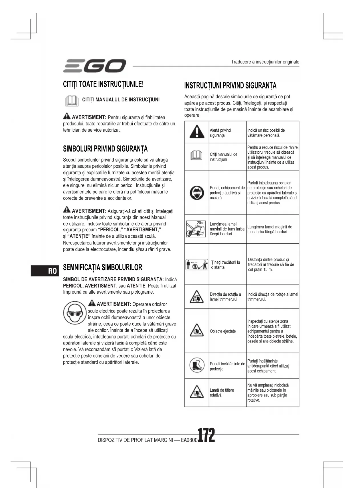 Această pagină descrie simbolurile de siguranţă ce pot apărea pe acest produs. Citiți, înțelegeți, și respectați toate instrucțiunile de pe mașină înainte de asamblare și operare. Alertă privind siguranțaIndică un risc posibil de vătămare personală.Citiţi manualul de instrucţiuniPentru a reduce riscul de rănire, utilizatorul trebuie să citească și să înțeleagă manualul de instrucțiuni înainte de a utiliza acest produs.Purtaţi echipament de protecţie auditivă și ocularăPurtaţi întotdeauna ochelari de protecţie sau ochelari de protecţie cu apărători laterale și o vizieră facială completă când utilizaţi acest produs. 20cm Lungimea lamei mașinii de tuns iarba lângă borduriLungimea lamei mașinii de tuns iarba lângă borduri 15m Țineți trecătorii la distanțăDistanța dintre produs și trecători ar trebuie să e de cel puțin 15 m.Direcția de rotație a lamei trimmeruluiIndică direcția de rotație a lamei trimmerului.Obiecte ejectateInspectați cu atenție zona în care urmează a utilizat echipamentul pentru a îndepărta toate pietrele, bețele, oasele și alte obiecte străine.Purtați încălțăminte de protecțiePurtați încălțăminte antiderapantă când utilizați acest echipament.Lamă de tăiere rotativăNu vă amplasați niciodată mâinile sau picioarele în apropiere sau sub părţile rotative. Traducere a instrucțiunilor originaleDISPOZITIV DE PROFILAT MARGINI — EA0800 173