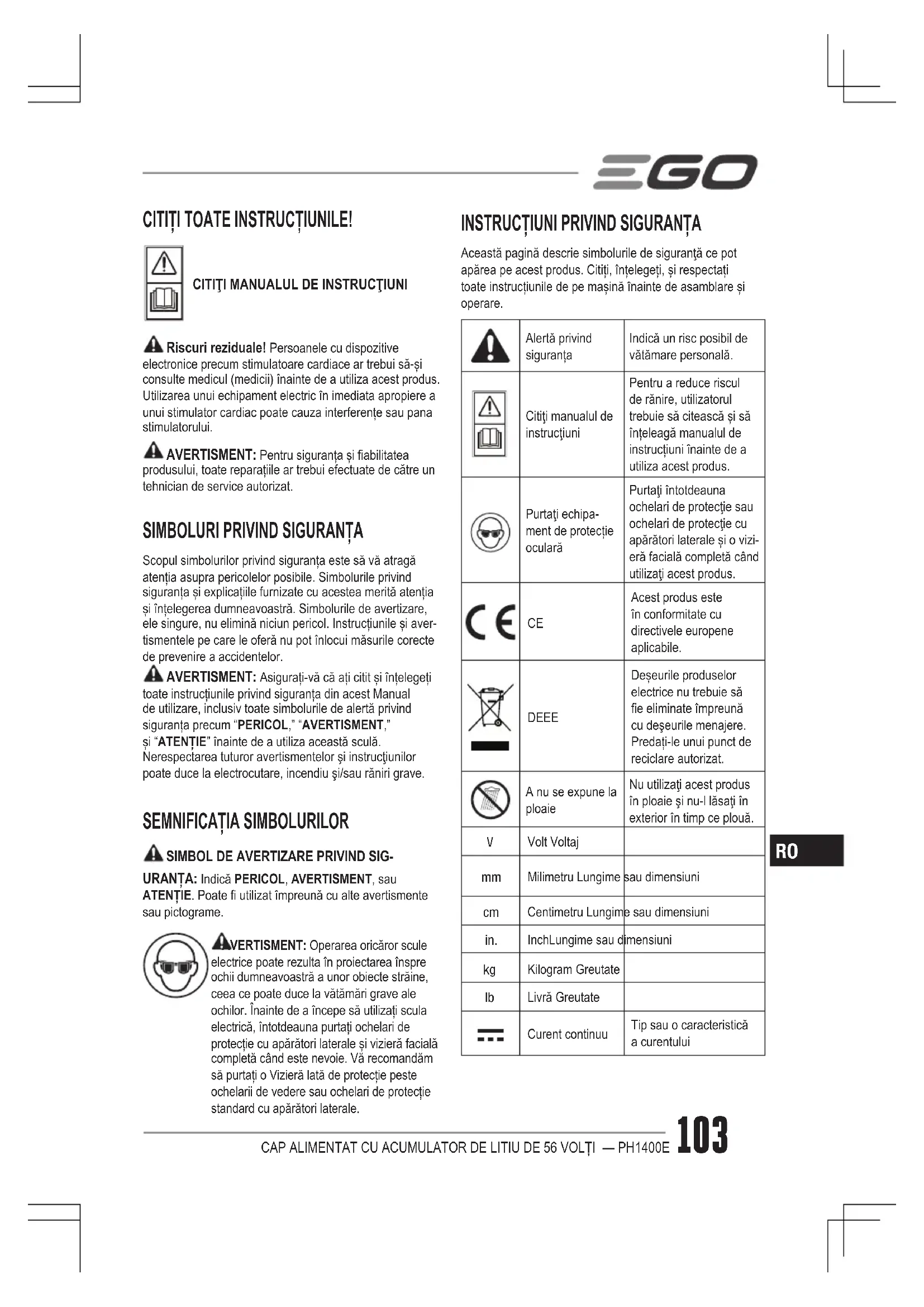 ◾ Apelați numai la o persoană calicată pentru a vă repara scula electrică utilizând numai piese de schimb identice. Astfel se asigură menţinerea nivelului de siguranţă al sculei electrice. ◾ În cazul situațiilor care nu sunt adresate în acest manual, utilizați grijă și raționament. Contactați centrul de service EGO pentru asistență. PĂSTRAŢI ACESTE INSTRUCŢIUNI!