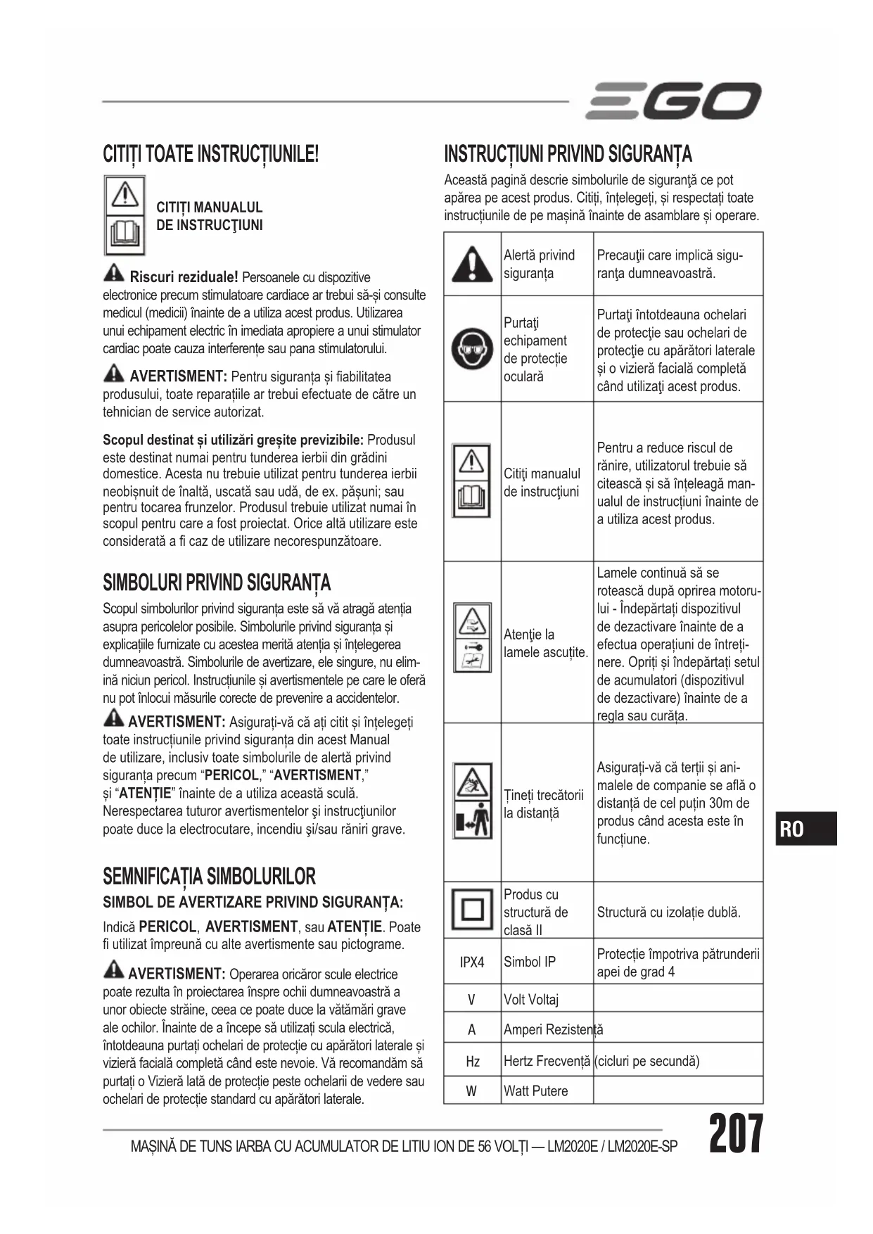 ar putea cauza răni grave. Calculați-vă traseul de mașinii pentru a evita evacuarea materialului înspre străzi, trotuare, trecători, etc. De asemenea, evitați evacuarea materialului lângă pereți sau obstrucții, care pot cauza ricoșarea materialului evacuat înapoi înspre operator. ◾ Pentru a se evita contactul lamei sau rănirea cu obiecte ejectate, stați în zona de lucru, în spatele mânerelor și țineți copiii, trecătorii, asistenții și animalele de companie la cel puțin 30m de mașina de tuns în timpul funcționării acesteia. Opriți mașina dacă cineva pătrunde în zona de lucru. ◾ Purtați întotdeauna ochelari de protecție sau protecții oculare în timpul utilizării și efectuării unui reglaj sau reparații pentru a vă proteja ochii. Obiectele ejectate care pot ricoșa pot cauza răniri grave ale ochilor. Întotdeauna utilizaţi o mască de faţă sau o mască de praf dacă operația creează praf. ◾ Îmbrăcați-vă corespunzător - Nu purtaţi haine largi sau bijuterii. Acestea pot prinse în piesele aate în mişcare. Utilizarea mănușilor și încălțărilor de cauciuc este recomandată când lucrați în aer liber. Purtați bocanci rezistenți, cu talpă groasă și pantaloni și cămăși strâmt. Sunt recomandate cămășile și pantalonii care acoperă brațele și picioarele și bocanci cu vârf de oțel. Nu utilizați niciodată acest aparat în picioarele goale, purtând sandale, încălțări alunecoase sau ușoare (de ex. din pânză). ◾ Nu puneţi mâinile sau picioarele în apropierea sau sub puntea de tăiere. Contactul cu lama poate răni mâinile și picioarele. ◾ Un capac lipsă sau avariat al gurii de evacuare poate cauza contactul cu lama sau răni provocate de obiectele aruncate. ◾ Multe răni sunt rezultatul mașinii de tuns ind împinse peste picior în timpul unei căderi provocate de alunecare sau de împiedicare. Nu vă apucați de mașina de tuns în cazul care cădeți; eliberați imediat mânerul. ◾ Nu trageți niciodată mașina de tuns înspre dumneavoastră în timp ce mergeți. Dacă trebuie să dați mașina în marșarier dinspre un perete sau obstacol, priviți mai întâi în jos și în spate pentru a evita împiedicare, după care urmați pașii următori: ◾ Pășiți în spatele mașinii de tuns pentru a vă întinde brațele la maxim. ◾ Asigurați-vă că vă puteți echilibra corect și aveți stabilitate. ◾ Trageți ușor mașina de tuns înapoi, fără să depășiți jumătate din distanța dintre mașină și dumneavoastră. ◾ Repetați acești pași cât de mult este nevoie. ◾ Nu operați mașina de tuns iarba dacă sunteți sub inuența băuturilor alcoolice sau a drogurilor. ◾ Nu utilizaţi niciodată aparatul cu apărători defecte sau fără dispozitive de siguranţă, de exemplu deectoare și/ sau fără colectorul de resturi montat pe poziţie. ◾ Fiţi vigilenţi - urmăriţi ceea ce faceţi. Apelaţi la bunul simţ. Nu utilizaţi mașina de tuns când sunteţi obosiţ. ◾ Mânerul de control al motorului/lamei este un dispozitiv de siguranță. Nu încercați niciodată să-l șuntați. Făcând acest lucru, dispozitivul de siguranță devine nefuncțional și poate cauza răniri personale prin contactul cu lama rotativă. Mânerul de control al motorului/lamei trebuie să poată utilizat cu ușurință în ambele direcții și să revină automat la poziția dezactivată când este eliberat. ◾ Evitați mediile periculoase - Nu utilizați mașina de tuns iarba în locuri cu umezeală sau ude. ◾ Nu utilizați mașina în ploaie. ◾ Menţineţi întotdeauna o poziţie stabilă. O alunecare și cădere pot cauza răni grave. Dacă simțiți că vă pierdeți stabilitatea, eliberați imediat mânerul de control a motorului/lamei și lama se va opri din rotit în 3 secunde. ◾ Opriți lama când traversaţi drumurile cu pietriş, alei sau străzi. ◾ Dacă echipamentul începe să producă vibraţii anormale, opriţi motorul şi identicaţi imediat cauza. Vibraţiile sunt în general semnul unor probleme. ◾ Inspectaţi pentru depistarea deteriorărilor; ◾ Înlocuiţi sau reparaţi piesele deteriorate care pot depanate de către utilizator; ◾ Vericaţi şi xaţi părţile care nu sunt slăbite. ◾ Nu puneți niciodată mașina de tuns în funcție dacă nu este echipată cu scutul tractat corect, capacul gurii de evacuare, sacul colector de iarbă, priza de tocare, evacuarea laterală, mânerul de control al motorului/ lamei sau alte dispozitive de siguranță instalate și funcționale. Nu utilizați niciodată mașina de tuns cu dispozitivele de siguranță avariate. Nerespectarea acestei instrucţiuni se poate solda cu vătămări grave. ◾ În cazul situațiilor care nu sunt adresate în acest manual, utilizați grijă și raționament. Contactați Serviciul clienți EGO pentru ajutor. ◾ Utilizați numai seturi de acumulatori și încărcătorii de mai jos: