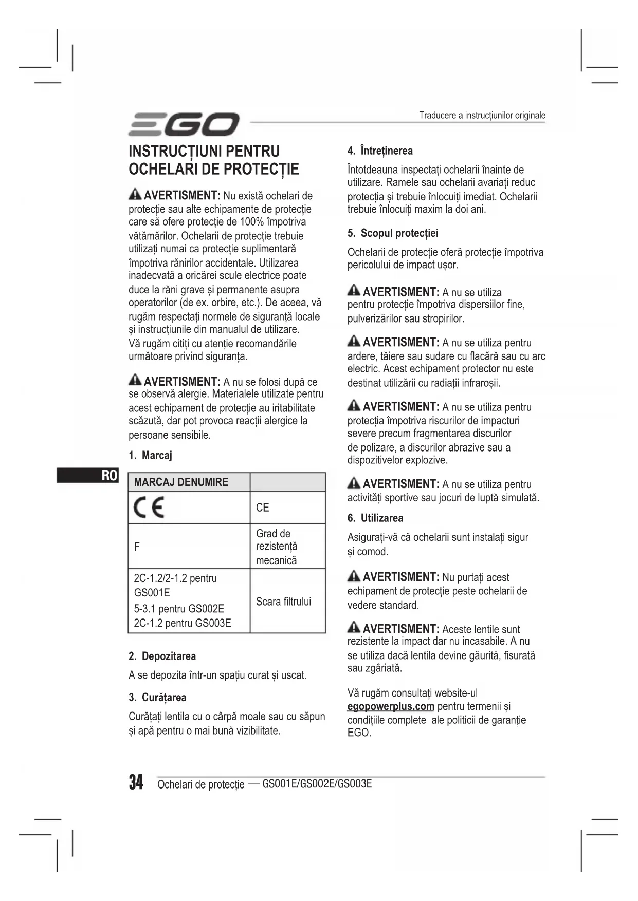 Asigurați-vă că ochelarii sunt instalați sigur și comod. AVERTISMENT: Nu purtați acest echipament de protecție peste ochelarii de vedere standard. AVERTISMENT: Aceste lentile sunt rezistente la impact dar nu incasabile. A nu se utiliza dacă lentila devine găurită, surată sau zgâriată. Vă rugăm consultați website-ul egopowerplus.com pentru termenii și condițiile complete ale politicii de garanție EGO. Traducere a instrucțiunilor originaleRO Ochelari de protecție — GS001E/GS002E/GS003E