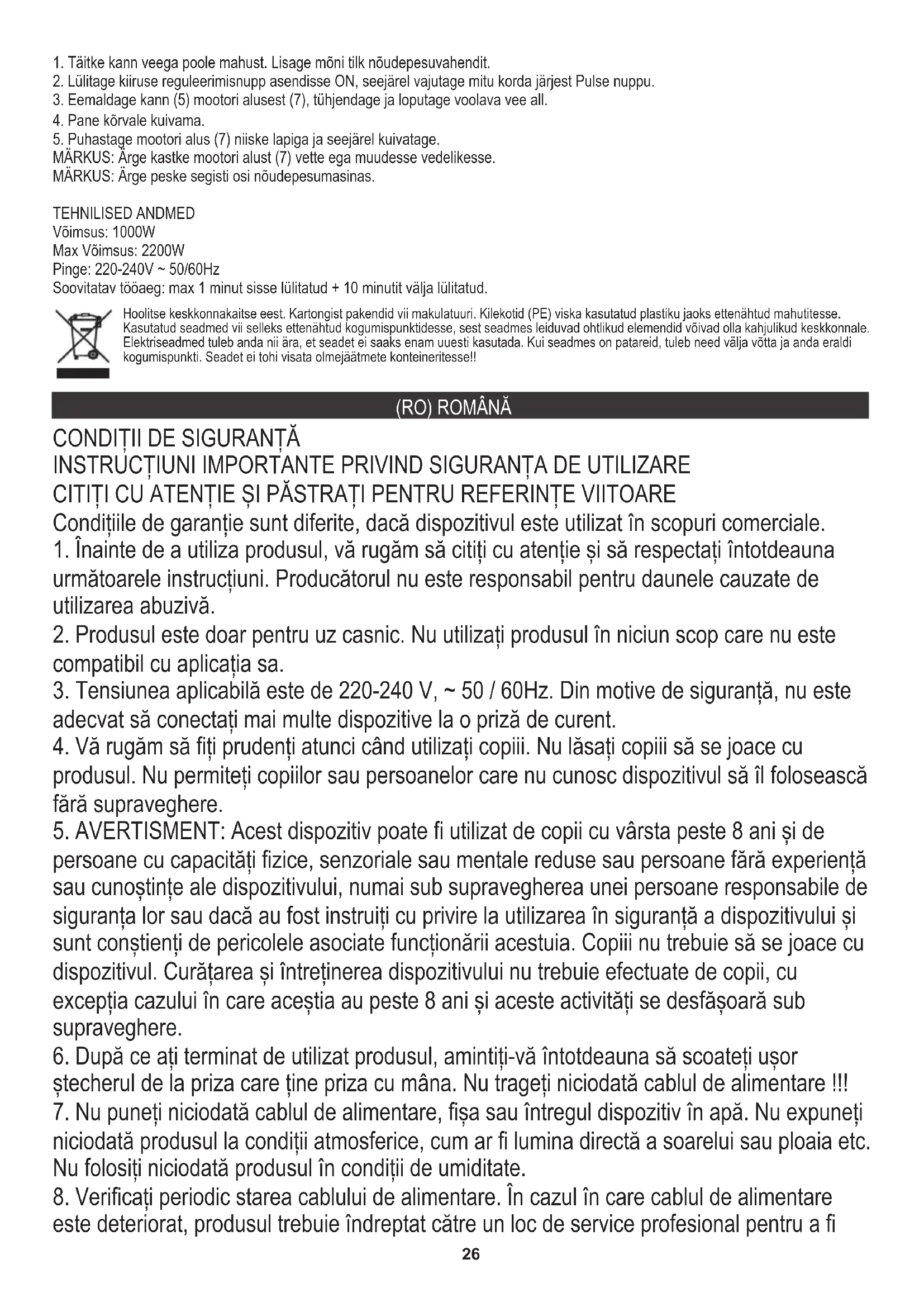 P - Puls: potrivit pentru amestecarea de scurtă durată (câteva secunde). Folosiți-l dacă unele bucăți de mâncare sunt prea greu de amestecat sau blocate.29 Max. Putere: 2200W Tensiune: 220-240V ~ 50 / 60Hz Timp de operare recomandat: maxim 1 minut pornit + 10 minute oprit. AVIZ: Nu spălați piesele blenderului în mașinile de spălat vase. DATE TEHNICE Putere: 1000W Din grija pentru mediul înconjurător. Ambalajele din carton vă rugăm să le transmiteţi şa centrele de maculatură. Sacii din polietilenă (PE) trebuie aruncate în recipientele pentru materialele plastice. Dispozitivul uzat trebuie transmis la punctul corespunzător de depozitare, deoarece componentele periculoase care se găsesc în dispozitiv pot fi foarte periculoase pentru mediul înconjurător. Dispozitivul electric trebuie transmis în aşa fel încât să se limiteze utilizarea lui repetată. Dacă în dispozitiv se găsesc baterii acestea trebuiesc scoase şi transmise către punctul de depozitare a acestora, separat. (BS) BOSANSKI