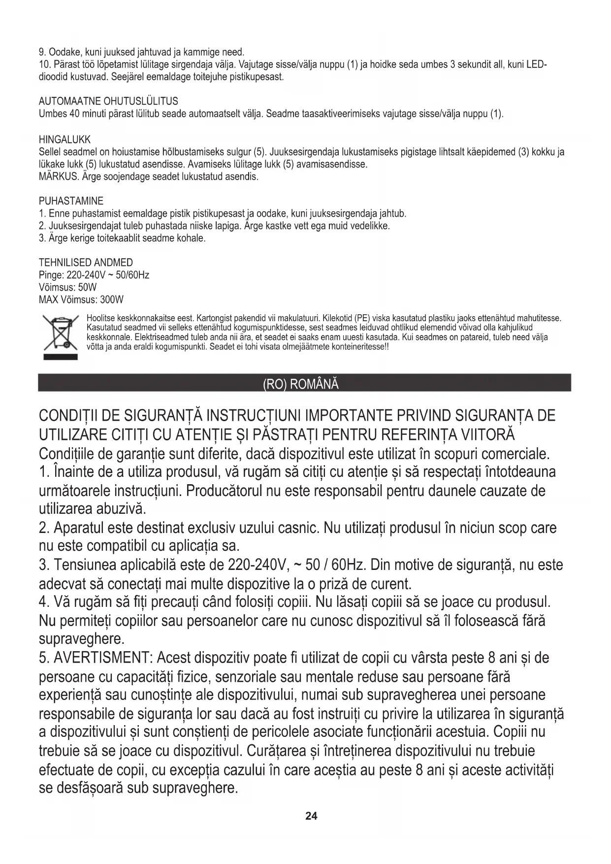 expuneți niciodată produsul la condițiile atmosferice, cum ar fi lumina directă a soarelui sau ploaia, etc. Nu folosiți niciodată produsul în condiții de umiditate (băi, cabane).