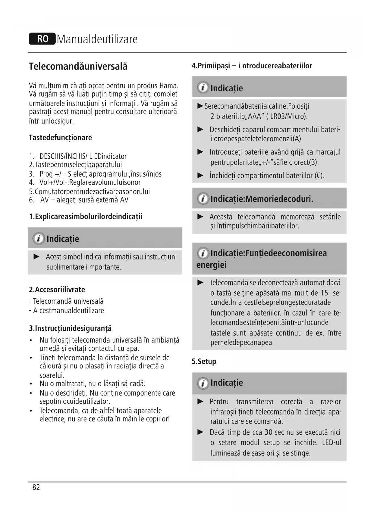 Indicaţie ► Se recomandă baterii alcaline. Folosiţi 2baterii tip „AAA”(LR 03/Micro). ► Deschideţicapacul compartimentului bateri- ilor de pe spatele telecomenzii (A). ► Introducețibateriile având grijă ca marcajul pentru polaritate „+/-” să ecorect (B). ► Închideţicompartimentul bateriilor (C). Indicaţie: Memorie de coduri. ► Această telecomandă memorează setările șiîn timpul schimbării bateriilor. Indicaţie: Funție de economisirea energiei ► Telecomanda se deconectează automat dacă otastă se ține apăsată mai mult de 15 se- cunde. Înacest fel se prelungește durata de funcționareabateriilor,încazul în carete- lecomanda este înțepenită într-un loc unde tastele sunt apăsate continuu de ex. între pernele de pe canapea.