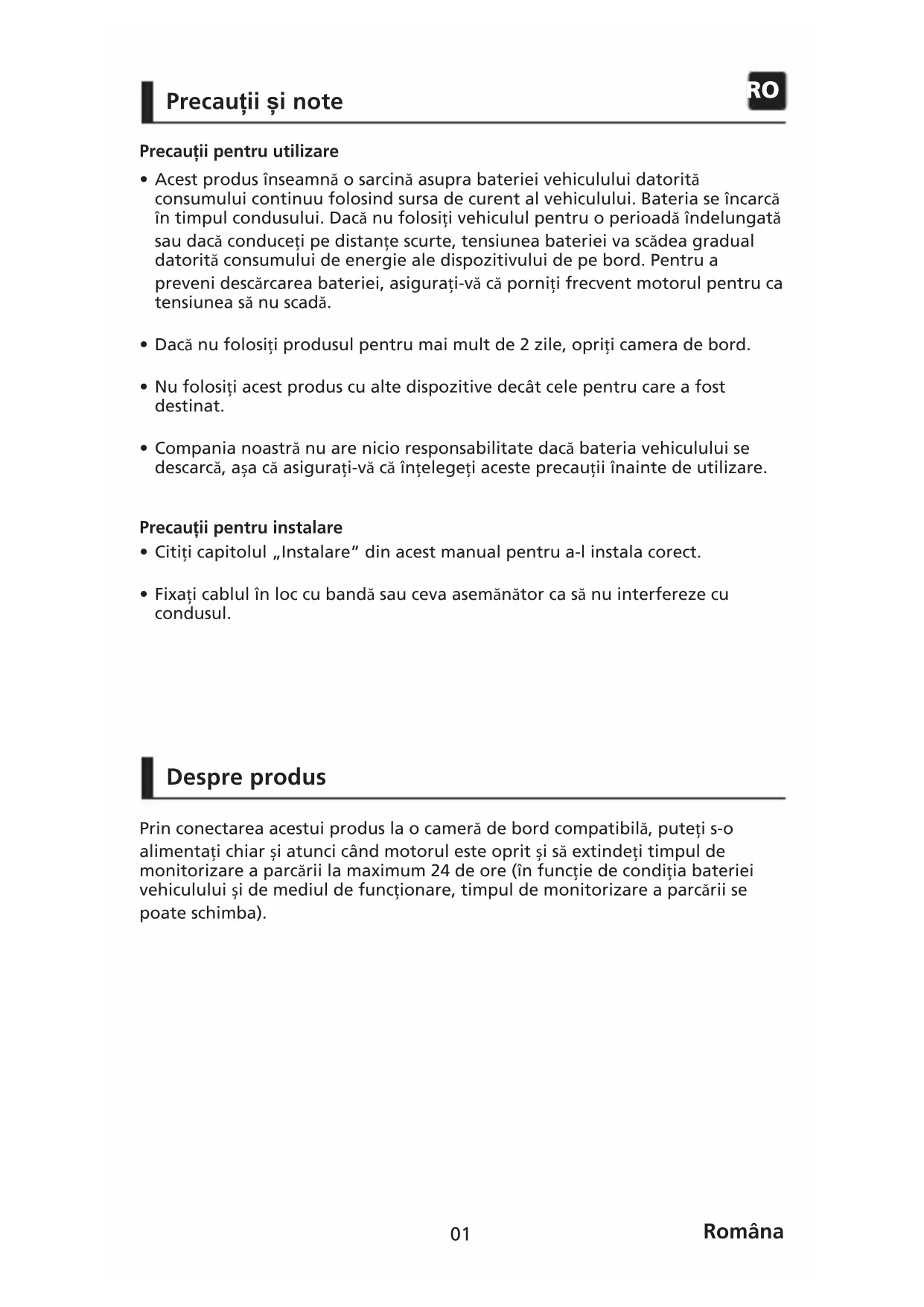 Precauții și note Acest produs înseamnă o sarcină asupra bateriei vehiculului datorită consumului continuu folosind sursa de curent al vehiculului. Bateria se încarcă în timpul condusului. Dacă nu folosiți vehiculul pentru o perioadă îndelungată sau dacă conduceți pe distanțe scurte, tensiunea bateriei va scădea gradual datorită consumului de energie ale dispozitivului de pe bord. Pentru a preveni descărcarea bateriei, asigurați-vă că porniți frecvent motorul pentru ca tensiunea să nu scadă. Dacă nu folosiți produsul pentru mai mult de 2 zile, opriți camera de bord. Nu folosiți acest produs cu alte dispozitive decât cele pentru care a fost destinat. Compania noastră nu are nicio responsabilitate dacă bateria vehiculului se descarcă, așa că asigurați-vă că înțelegeți aceste precauții înainte de utilizare. Citiți capitolul „Instalare” din acest manual pentru a-l instala corect. Fixați cablul în loc cu bandă sau ceva asemănător ca să nu interfereze cu condusul.