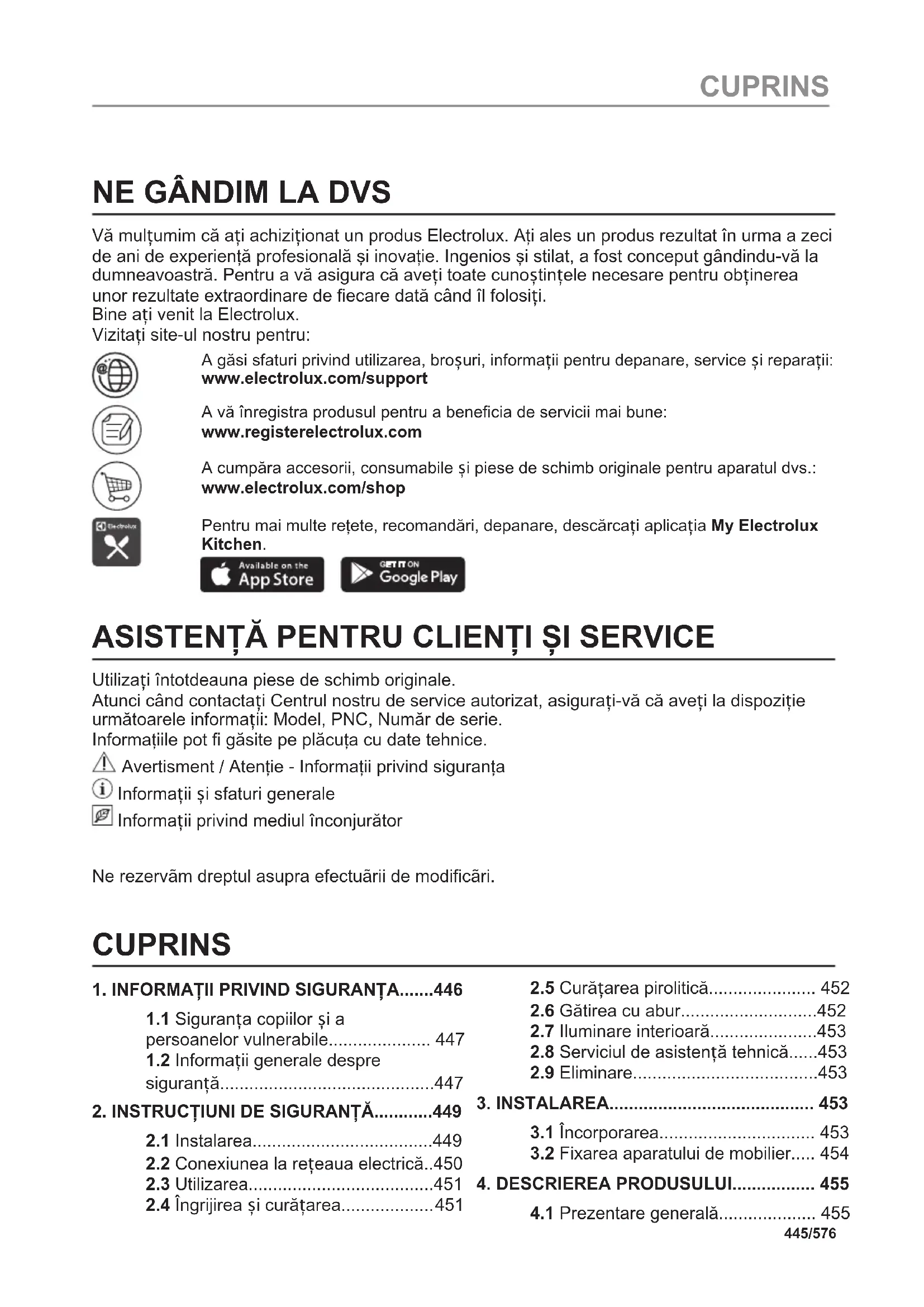 Recicle os materiais que apresentem o símbolo . Coloque a embalagem nos contentores indicados para reciclagem. Ajude a proteger o ambiente e a saúde pública através da reciclagem dos aparelhos eléctricos e electrónicos. Não elimine os aparelhos que tenham o símbolo juntamente com os resíduos domésticos. Coloque o produto num ponto de recolha para reciclagem local ou contacte as suas autoridades municipais. 444/576 ESTRUTURA DO MENUNE GÂNDIM LA DVS Vă mulțumim că ați achiziționat un produs Electrolux. Aţi ales un produs rezultat în urma a zeci de ani de experienţă profesională şi inovaţie. Ingenios şi stilat, a fost conceput gândindu-vă la dumneavoastră. Pentru a vă asigura că aveți toate cunoștințele necesare pentru obținerea unor rezultate extraordinare de fiecare dată când îl folosiți. Bine ați venit la Electrolux. Vizitați site-ul nostru pentru: A găsi sfaturi privind utilizarea, broșuri, informații pentru depanare, service și reparații: www.electrolux.com/support A vă înregistra produsul pentru a beneficia de servicii mai bune: www.registerelectrolux.com A cumpăra accesorii, consumabile și piese de schimb originale pentru aparatul dvs.: www.electrolux.com/shop Pentru mai multe reţete, recomandări, depanare, descărcați aplicația My Electrolux Kitchen.